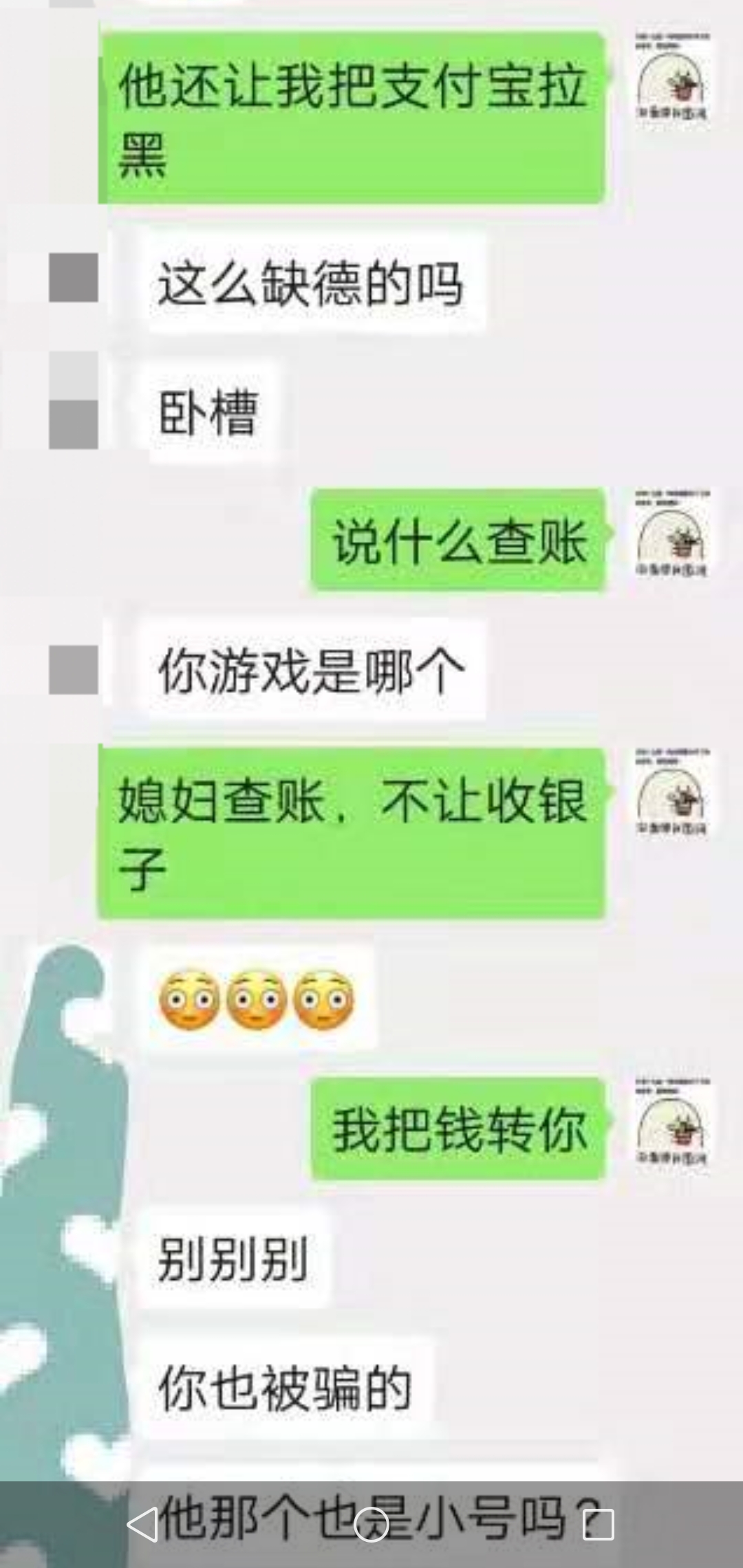 R出精粹,队伍里拉个装评高的骗说是自己的大号,要求对方先给钱,一收到钱立刻原地解散队伍下线。相信大家经常看到有人把骗子的支付宝账号曝光出来,交易时遇到提示有风险的都会心生警惕。 近日,有骗子把这样的骗术玩出了新的花样,让你无从找人。 灵岛仙踪的玩家1某天傍晚在世界看到有人收银两,虽然对方是小号,可是愿意先给钱,就愉快的交易了。只是交易时对方有点奇怪:不用分几次,一次性全给,我用媳妇的支付宝转你,转完你马上拉黑,我怕媳妇查账。 (图片出自:帅老全) 当天晚上,玩家1微信上收到一个加好友请求,对方头像和傍晚收银两的支付宝头像一样,玩家1以为是想长期收的就加了,聊过后才发现,原来对方也是被骗的。 (图片出自:帅老全) 原来,骗子用不同的两个小号,在六和听涛用拉人冒充大号的老骗术让收精粹的玩家2先给钱。 同时在灵岛仙踪跟玩家1说先给钱,得到玩家1的支付宝账号拿去给玩家2交钱。 等玩家2交了钱就原地解散下线,坐收玩家1的银两。 最终骗子既收获了银两,自己又完全没有任何信息被暴露,只损失了两个可有可无的小号。 更多精彩内容,尽在叶子猪倩女幽魂。 |