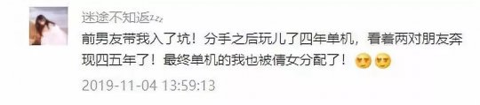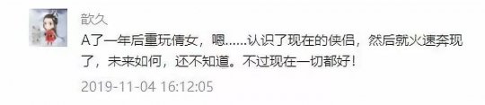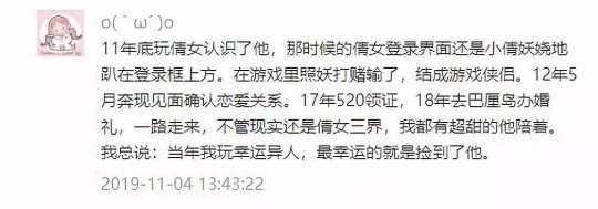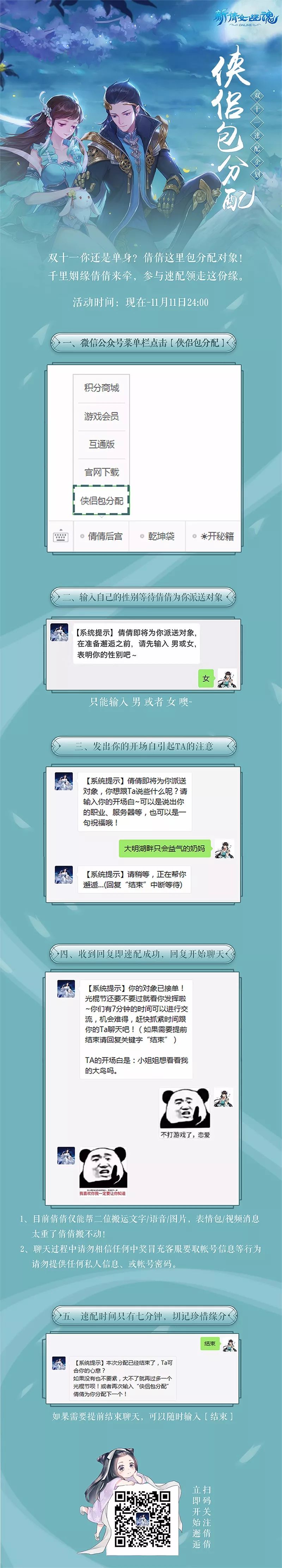 今天是己亥年乙亥月壬子日 2019年11月11日 更是光棍节! 但很可惜快递和侠侣你可能一样都没有 还要接受来自他们的狗粮! 本文高甜,有侠侣的抱着侠侣食用 没有侠侣的…… 一定要看到坚持看到文末! 新服开新号发现新侠侣竟是旧侠侣?! 来源:微博私信投稿 百因皆有果,你的侠侣都是我,下面这对侠侣的缘分简直就是一分靠打拼,九分天注定! 女主角在A服有侠侣,和朋友约好去新服,没想到新服勾搭的新侠侣竟然还是旧服的原侠侣!倩倩送给当事人两个字:刺激! 倩倩有个大胆的猜想:究竟是命运的捉弄缘分的凑成,还是侠侣其实有意而为之? 真相倩倩不得而知但倩倩在这里一定要祝你们 傲娇侠侣竟偷偷上我号完成“女装”宿愿! 来源:微博私信投稿 人类的感情无法共通,侠侣的时装一定要共享。 上侠侣的号只为穿上女装,还被现场识破是什么体验?吃瓜群众已准备就绪! 三界婚介所盛名在外 业绩有眼所见 成功案例远不止以上这些 无数受益人来为自己的奇妙爱情发声 别人夫妻双双把家还 自己却还是孤独的狼 不必质疑自己玩的倩女是假的 不必安慰自己侠侣只会影响拔刀的速度 找侠侣的明路倩倩来指好 不让大家在情缘路上跌倒 双十一限时开启【侠侣包分配】通道 快递爱情两都要! 只要你主动一点点你的TA就在分配的路上了!事不宜迟,现在立刻马上参加【侠侣包分配】活动倩倩立马为你派送对象! |