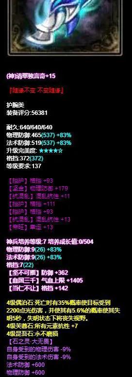 宅在家的这段时间比起锻炼厨艺却做出黑暗料理更绝望的是想和大佬切磋交流经验结果却说不了话 倩倩仔细一看原来是被大佬的声声慢控得正憋屈快来一起品味一下高敏捷高抗性的魅者大佬的装备有多么让人沉默和流泪 昵称:゛封狼居胥ゝ° 等级:150级 职业:魅者 服务器:[挑灯看剑] 帮会:修戈 (以下数据更新于梦岛2020.2.22) 武器 大大的这把琴扇 首先就让双魅者技能一起助力 声声慢+6、狐步虚声+6 再带上沉默抗百比+敏捷 将技能、抗性和敏捷都考虑周全 就是为魅者量身打造的武器 声声慢和狐步虚声一出手 如果沉默不行还能变狐 就是不让你有还手的余地 布甲 不修+3物躲+强眩晕的七绝布甲基础属性+50%防御控制有信心,躲避也给力再打上石之灵善根生防护加倍就能够更安心 布盔 晕抗百比+双物躲+双法躲的布盔 同样十分周全 躲避和抗性兼顾 叫你怎么打都打不到 护腕 3格挡+物防的护腕 防御能力没话说 双混抗还提供抗性加持 再打上石之灵大无畏 稳健地诠释什么叫能控也能扛 手套 4敏捷的七绝手套先保证控你一控一个准加上晕抗+混抗+物防在赛场就能安心出手 抗性都还保留着 大佬的抽冰也很ok 腰带 同样双物躲+双法躲的这条腰带 仿佛和布盔是好兄弟 还有晕抗+混抗的助力 没有敏捷就保证抗性和躲避 照样让你体会失手的滋味 鞋子 双法躲+物躲+双敏捷的鞋子溜得够快打不中还有晕抗+混抗百比的保护将抗性也从头包装到脚 抗性需求得到满足就不会被对手轻易控住 项链 大大的项链也是熟悉的配置 3敏捷+晕抗+混抗 将敏捷和抗性贯彻始终 在赛场上就既灵敏又不怕被控 手镯 大大的手镯也为你送上“失手套装”8敏捷+双混抗百比抗性能力大幅提升还有敏捷的护航保证控你控到脾气全无 戒指 敏捷和抗性必须照顾到每处细节就像这对7敏捷再带上混抗百比+双晕抗的戒指抗性有提升,灵敏有保证赛场上控人就更随心所欲 这位魅者大大的装备以 敏捷、抗性和躲避为主 武器、手套等装备多走敏捷 鞋子、手镯、戒指等有抗性助力 敏捷+抗性能够保证控制技能不失手 提高抗性就不容易被控 布甲、布盔等装备多为躲避词条 让生存能力更进一步 赛场上就更加如鱼得水 对于大魅者来说切装很重要 但魅者的切装多是不能公开的秘密 梦岛上也暂时无法得知大大的切装情况 所以倩倩在这里先展示大大的正装路线 如果有了解这位大大切装情况的 欢迎在留言里一起讨论~ |