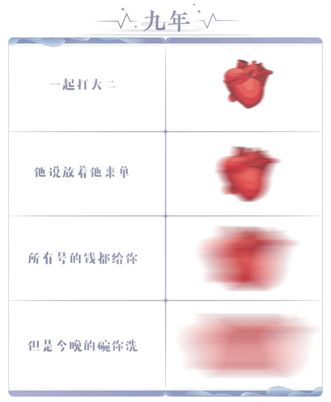 倩倩暗中观察了三对侠侣 结侠侣时间从9天、9月到9年 处于不同阶段的他们相处模式截然不同 但爱意皆有迹可循 来体会他们各自心动的感觉吧 (*以下故事人物均为化名) 结婚9天 一切是那么的新鲜 秦风和小离一周前刚结为侠侣。很显然,对于他们来说新婚的感情是炽热和新鲜的,会因为对方的一句话逐字揣摩,欣喜地卷着被子打滚。 秦风一个人在国外,每天忙碌过后的消遣就是玩倩女,对于他来说时差和网络延迟问题不大,反正固定队里好几个夜猫子,入坑一年多以来大家每天都在一起聊天,能很好地排解自己身处异国他乡的孤独感。 他们的初相遇是很寻常的组野队打大二,队友都还没上线,秦风双开缺人就随便喊了个。进去之后刚想分配一下这个叫“小离”的奶妈妹子守哪路,发现小离已经抢了先“我想试试单。”秦风的眼皮跳了跳…还是忍住没说话,只是默默走到了中间准备以防万一。 只是没想到小离单的十分稳健,期间还有空和秦风聊天“你咋不再开个号?。”“懒。”“懒不死你…”秦风笑道:“感觉这个妹子还挺直接的,后来直接加了我好友说每天带我。” 一起做了几天大二,秦风发现小离还没有固定队,于是顺理成章“拐”到自己队里。“其实之后的一个多月都没有什么进展,但是我发现她特别会照顾人,熟了以后会提醒每个人收菜种菜,不要忘记领领奖点,在有人不在的时候还会主动帮着开号挂任务。当然,因为时差的缘故大部分时间都是帮我在开。” 秦风不是没有结过侠侣,只是已经过去很久,自己都快忘了那种感觉。加上一个人在国外生活,小离的出现就像捅破了那层窗户纸,很自然地就对这个女生产生了好感。“在游戏中邂逅的感觉很奇妙,一旦有了好感之后,情绪起伏很大,开心和难过都被放大了很多倍。” 表白那天非常的戏剧化,秦风表示到现在还觉得很尴尬。那天任务完成后,秦风将固定队其他人都踢出了队伍,只留下了小离,却将一句“我的家园还缺个女主人”不小心发到了帮会频道,翻车后帮会群里一片爆笑。小离直言她当时差点想退帮走人,不过最终还是答应了秦风。 新婚燕尔,两人天天黏在一起。上线就会收到对方的邀请,即使人不在电脑前也会组着队一起在易市挂机。相信很多玩家朋友们都有过这样的经历。这两天也终于开始研究起原先“和自己无关”的侠侣副本,短期目标是刷到九世。 也许是终于确立了侠侣关系,两人彻底放飞自我,原有的最后一丝高冷也消失不见了,各种骚表情发个不停。 秦风教学时间 网恋是甜的,异地是苦的,想念了也抱不着,但就是心里莫名有了寄托。小离觉得秦风其实还是个平平无奇的骚话小天才,字里行间的甜蜜、为对方准备的小惊喜,每天的悸动都让他们对这段缘分有了更多的期待,希望能走得更远。 结婚9月 小摩擦、小情绪、倦怠期 踏入结婚的第九个月,也是不打不相识的故辞和书墨互相磨合的第九个月。每次吵架都恨不得踹对方一屁股,但又会因为对方不经意的小事而感动,把不愉快忘得一干二净。 故辞是男魅者,书墨是女画魂,当时第一次相遇就是在关宁,故辞正在捡旗子,书墨开着免疫就直接朝自己冲过来,冻住了故辞几下蝴蝶就带走。故辞记仇一样记住了这个同区的戴着黑熊头的萝莉画,关宁如果遇见了也喜欢盯着她控多几次。 在当天的最后一场被控的不行只能再次玉石了对方后,书墨忍不住发了一个跨服喇叭点名“挑衅”:“这个叫故辞的骚魅,关宁总是盯着我是不是看上我?”只是没想到故辞直接加了她好友回了个“对!”(书墨说这可能是这个闷骚胖子做的最奔放的一件事了。) 不同于故辞的闷骚,书墨性格风风火火,都喜欢PVP但脾气大相径庭的他们最后走在了一起,只能解释为在单身的时候遇上了记忆深刻的人。 几个月的相处下来已经萌生了不少摩擦。有一次书墨闹小脾气正好又遇到分到对面场,故辞在打团的时候不小心又没看清楚目标,控了书墨两次。 本来就有气的书墨更加生气了,投笔破幻扎进对面人堆直冲故辞,却被故辞的定身定住不能动,然后书墨就在人群里被围殴打死。于是书墨开始置气地将绝技进阶玉石全往故辞身上砸,仿佛两人不是侠侣是敌对。 这场关宁结束后,两人都只字未提,也没有主动去和对面说话。书墨心里火超大,而故辞心里也很不是滋味。 故辞想起两人当初在关宁里也是这么相遇的,后来也因为关宁慢慢走到了一起。两人性格虽不同但志趣相投,他话中藏的梗她也全都懂。每次做任务下副本,书墨都冲在前面,故辞在后面优哉游哉地划水。“我的魅者帅就行啦,输出我一个顶俩不行吗,带他划水我乐意~” 故辞现在换了偃师,同门相爱相杀的节奏 想起许多两人相处时的快乐,也明白他与书墨成为侠侣的不易,更加懂得成为侠侣之后两人要不断磨合不断理解,才能把每一次的小摩擦处理地更好,不会产生倦怠。故辞决定认怂化解矛盾,他也知道书墨的脾气来得快去得也快。 两人把事情说开了都互相说了自己的不对之处。后来的关宁里两人都非常照顾对方。现在两人关宁看到对方在对面都会愁眉苦脸:“这打是不能打了,可万一丢个群擦死了或者宝宝偷个人头,结束之后还要生气。” 在顺风场的故辞会在yy里告诉书墨大部队的位置,让她赶紧走:“我们快到那个水里面的圆台了,你赶紧从中间穿到对面去,我们这太凶了。” 故辞觉得,自己还想和书墨打很多很