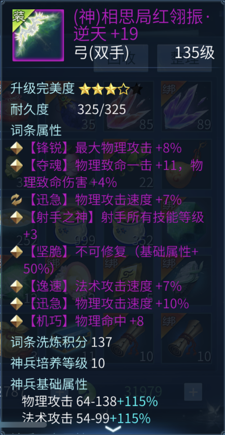 此件装备不仅是逆天三最大24%的优质武器,并且携带息兵、智力等优秀词条,后期通过抽冰还可以再补充一条攻速词条, 无疑是方士、画魂、剑仙修士首选的兼顾输出与拉扯能力的武器。 - 来源:笑忘归@Volim - 乍一看此件装备作用并不显著,但是将其交予方门修士,在门派挑战场景中,双火抗%的布甲能比双五十带来更多收益。 - 来源:投稿@锦鲤金金 - 此件137级鬼装弓仅用一抽便置换出一条物理攻速,后续凭借7次洗炼,成功洗出逆天不修+满物理攻速的极致词条,道友气运之盛,简直难以置信。 - 来源:投稿@萌宝ヅ - 此次投稿中还有一件抽冰与洗炼皆甚为幸运的拂尘。投稿道友表示,这把拂尘经过87次抽冰拿下最大与不修,后续仅花费2万+洗炼分,便铸就了这把7绝最大+双五十+攻速与最小的极致输出武器! -来源:投稿@蔡铁蛋。 - 论“整活”还得看三界道友,上来便投来一件?“蒲家村王者级”?护腕。逆天3大幅+3格挡+混抗,属性不仅面面俱到,各词条的数量更是出奇地一致,绝非凡品! - 来源:投稿@山海入梦来〃 - 若抽出此种3精力与法力上限的头盔,道友不必心灰意冷,此件法器或许恰好是某位画魂大能苦寻的极品布盔。 - 来源:投稿@太一 - 虽然道友气运不浅,但却有些走偏,这件固定双五十的109级鬼装鞋子,若在数年前,必是抢手之物,但时至今日,吸引力已不似往昔。 - 来源:投稿@奀奀. - 抗物理致命乃是目前限制物理系爆发的关键词条,这件69级手套仅用102分便洗炼出5条抗物理致命词条,此等欧气当真令菌菌叹服,诸位69等级段修士尽可入手一试。 - 来源:投稿@乃不活毒不死 - 编辑:月光下完美
