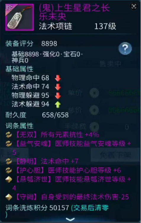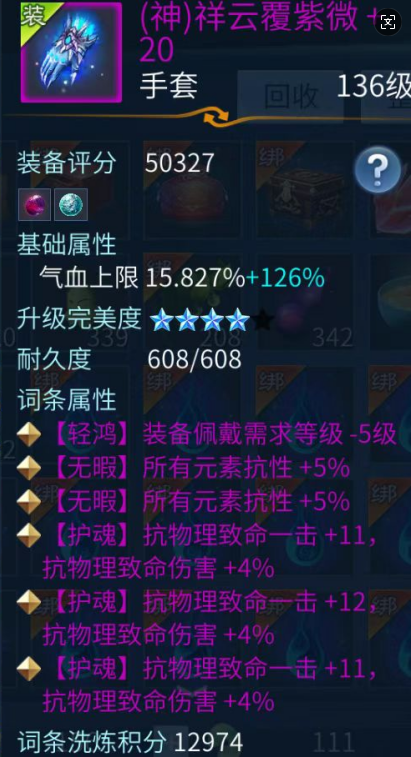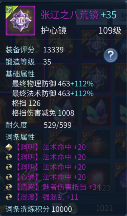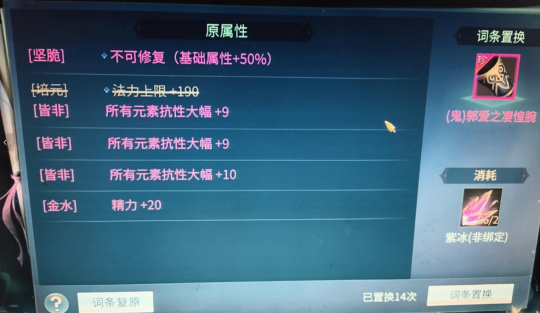 背饰不仅是法系职业追求忽视的绝佳法器,也是限制物理系爆发的不二之选,此外,全控制抗属性的背饰,更是控制系职业的梦魇。这件5混抗背饰,仅一件装备就提供了63点混抗属性,魅者修士恐怕已经对此感到头痛不已了。 - 来源:投稿@大明湖畔猪刚鬣 - 另外还有一件护心镜,对魅者修士的克制亦是突出,固定4条满数值的法术命中,再加上魅者伤害抵当与强混词条,属于是全方位兼顾。 - 来源:投稿@是2c呀 - 护腕虽然是追求元素抗的首选装备,但如果在固定不修+双大幅的基础上,再增加一条大幅词条,同样是非常称心的选择! - 来源:投稿@玉兔捣药* - 一件法器就容纳了四种类型的有效词条,怎能不令人艳羡!本次三界投稿中,菌菌收到了一件携带混抗、晕抗、全元素抗%、抗物理致命与不可修复共5个优质词条的极品腰带,不仅辅助职业心驰神往,似乎还颇为契合剑仙修士。 - 来源:太阳神鸟@小陆Sunny - 自从高级复原功能上线后,逆天品质装备凭借更多次的抽冰机会,以及更容易携带有效词条的特性,吸引力愈发显著。比如这件109级鬼装布甲,在洗出逆天词条后,又在固定位置换出一条不可修复,一下让这件布甲身价骤升。 - 来源:神雕侠侣@小葵葵 - 全元素抗的风潮在109等级段刮起后,势头日见兴盛,如今皮盔都开始准备起了双全元素抗%,不知是哪位单手射修士正在筹谋全元素抗之路。 - 来源:出水芙蓉@是救赎也是遗憾 - 一件固定位词条相当优秀的紫装手套,固定位拥有轻鸿、抗物理致命与双全元素抗%,是一件能被129级飞升修士装备的手套,后续洗炼得到的2条抗物理致命,让这件装备的属性变得更加扎实。 - 来源:帝都风云@心做し - 此条项链算得上是全元素抗属性与职业技能完美适配,全元素抗%与益气安魂、护心胆、悬瓠济世技能并存,实乃医师大能苦寻的顶级之物! - 来源:笑忘归@神仙 - 编辑:月光下完美