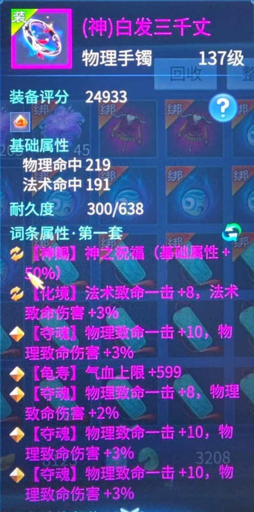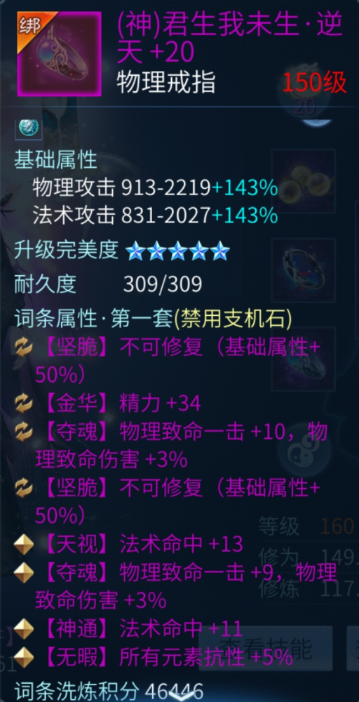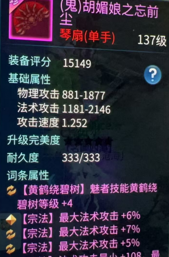 因为仙家法宝有部分位置可以洗出忽视词条,所以全套双忽视水抗已经成为众多玩家追求的终极目标,但这次菌菌收到了一位来自壮志凌云服务器画魂小伙伴的投稿,他的法宝竟然拥有全套高数值的三忽视水抗,总计高达122点,实在是出色! - 来源:壮志凌云@特鲁姆普 - 除了高数值的忽视水抗外,本期还有一件四水抗的四阶离位仙家法宝,一共给到40点水抗数值,相比3件10级曲水纹的总加成还要高,相当具有针对性。 - 来源:纵横天下@不良人. - 不知道各位玩辅助职业的小伙伴对下面这枚戒指印象如何?戒指的词条不仅拥有双不修,还涵盖了混抗%与毒抗%。对于医师而言,在门派中可以大幅提高实力;对于侠客来说,此枚戒指兼顾团战与单挑,并且物理命中与力量词条也有不小的增益。 - 来源:神雕侠侣易市 - 同样还有一枚优秀的物理系戒指,不仅是逆天属性,还携带了双不修、双物理致命,同时附带一条全元素抗%词条,完美诠释了“攻守兼备”。 - 来源:神仙居@2战区收JP装备 - 又来一件固定双不修的装备!号主在一次抽冰中,成功置换出固定双不修+混抗%+根骨的优质手套,后续又洗练出了7绝三不修,为角色带来大幅气血加成。 - 来源:紫金王朝@悟剑 - 随着近几轮对剑仙职业的优化调整,剑仙在对局中的发挥空间显著提升。这位69等级段的小伙伴,在近期顺利拿下一件五最大法术攻击加成灵剑,总计41%的数值加成,再配合上剑心通明的被动效果,最大与最小攻击得到明显提升,实战中一定能发挥出不俗的压制力。 - 来源:紫金王朝@悟剑 - 固定三最大不止出现在灵剑中,这件固定三最大法术攻击加成的琴扇也相当亮眼,与此同时还有一条黄鹤绕碧树等级+4,并且还是一件未绑定的装备,相信会让不少魅者小伙伴心动不已。 - 来源:五福临门@有说法. - 固定词条已经相当优秀,没想到在洗炼大法的加持下,号主居然还能再添三条物理致命,据投稿小伙伴描述,跑遍三界地图才能修成这样的“正果”,不说了, 菌菌立刻上线一试! - 来源:投稿@桃栀 - 编辑:月光下完美