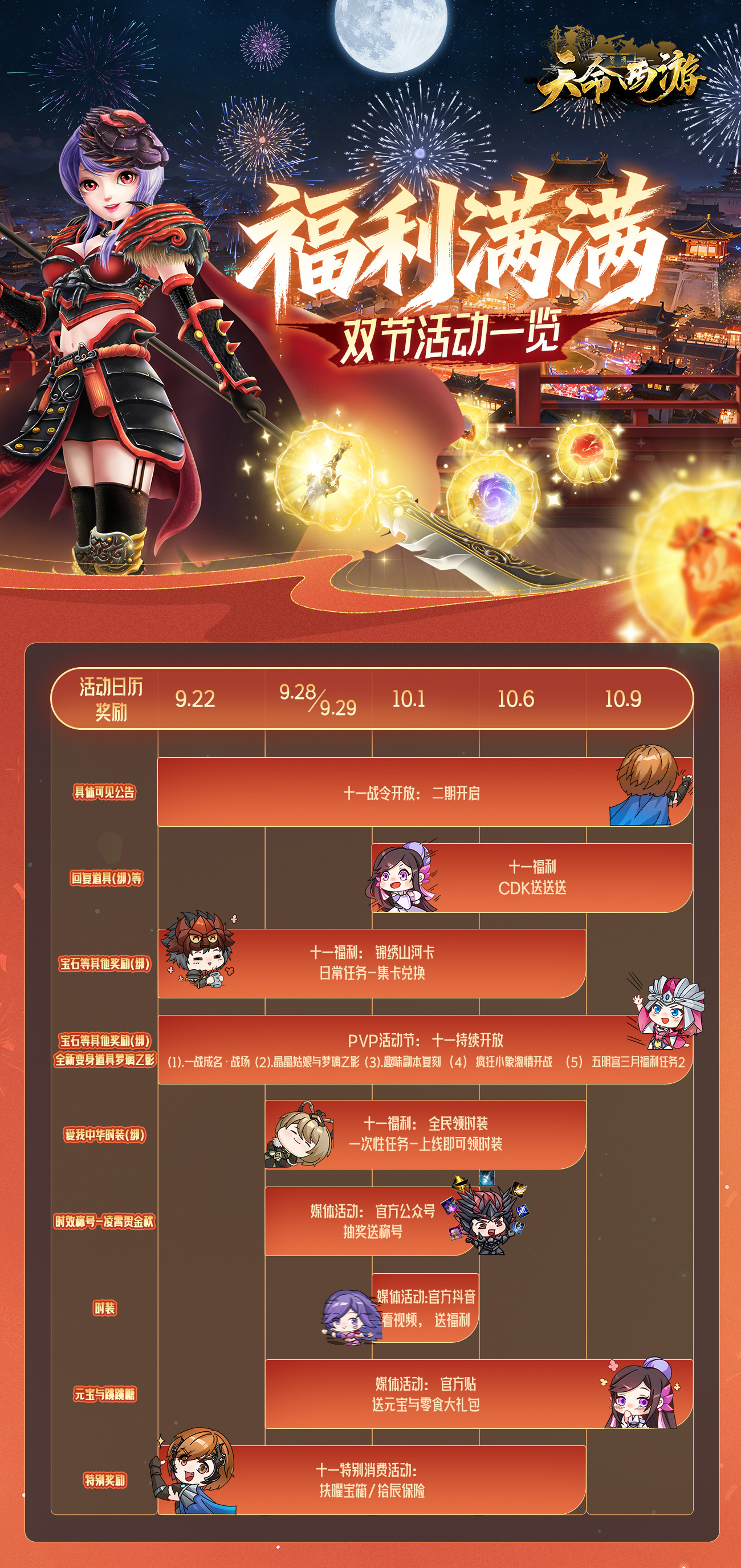 “妙岩宫”、"玉清宫"、“五明宫”,将于2025年9月29日10:00进行例行维护更新,预计更新维护时间4小时,请各位玩家互相转告提前下线。感谢大家对我们工作的支持! 【内容调整】 五明宫: 1. 世界BOSS仅在周日出现的“70级广目天王化身”更换为“喵星大魔王”,“喵星大魔王”难度略高,掉落不变 (坐标:4线 万寿山5299,2158 ),时间不变(每周日20:00~23:59) 2.?关于五明宫开放70级装备的意向调查。 【活动开放】 活动任务:十一送时装啦!!!【一次性】 活动时间:2025年9月29日维护后 - 2025年10月6日维护前活动等级:55级活动NPC:国庆巡礼使·山河(2522,710)活动内容:锦绣山河,惟愿此刻永驻。对话完毕后可于“国庆巡礼使·山河”处提交任务!任务奖励:爱我中华(男)时装盒(绑)*1 或 爱我中华(女)时装盒(绑)*1 任选其一 活动2:双节至,媒体活动开启! 官方抖音看视频,官方公众号拿称号,方贴吧福利送上精彩福利啦! 【活动关闭】 1. 关闭活动“疯狂的小象,战斗吧!”,活动关闭后将不在掉落“疯狂小象牙”,关闭对应的兑换 【当前活动】 活动一:国庆守卫·击败捣蛋鬼【日常】 活动时间:2025年9月22日维护后 - 2025年10月6日维护前活动等级:55级活动NPC:国庆巡礼使·锦绣(2522,708) 活动内容:在长安郊外击败3个“捣蛋鬼”,完成后返回国“国庆巡礼使·锦绣”处提交任务。任务奖励:二十四节气令牌(绑)*1、二阶炎阳火(绑)*1活动二:国庆巡礼·名胜留念【日常】 活动时间:2025年9月22日维护后 - 2025年10月6日维护前活动等级:55级活动NPC:国庆巡礼使·锦绣(2522,708)活动内容:前往“花果山”采集一朵团圆之花,完成后返回“国庆巡礼使·锦绣”处提交任务。任务奖励:装备精炼材料(绑)*2、节气羽翼兑换卡(绑)*1 活动三:国庆活动·锦绣山河 活动任务1:获取锦绣山河卡【日常】 活动时间:2025年9月22日维护后 - 2025年10月6日维护前活动等级:55级活动NPC:国庆巡礼使·锦绣(2522,708)活动内容:锦绣山河,惟愿此刻永驻。快来领取你的国庆特别活动奖励吧!接取本任务即可完成任务!任务奖励:锦绣山河卡(绑)*1※【锦绣山河卡(绑)】可在NPC“国庆巡礼使·锦绣”处兑换活动奖励 ※【锦绣山河奖励升级券(绑)】可在商城购买,售价:1000元宝 活动2:双节福利CDK大放送! 活动时间:2025年9月29日更新维护后,CDK内容敬请期待! 活动四、撒花巡游活动时间:2025年9月29日-2025年10月5日 每日20:00、21:00 (一线)活动地点:长安皇宫、长安城的主要街道活动等级:20级活动NPC:长安NPC“小花童”长安皇宫(2525,193)活动开始前出现,活动结束时消失活动内容:活动开始时玩家可以通过任务领取5个庆典花束(绑)(即每天最多领取10个)。用花束能对巡游队伍撒花,每次撒花都会得到奖励。活动奖励:用花束能对巡游队伍撒花后将随机获得以下物品的其中一种注:时效奖励为获得即开始倒计时计算魂羽仙腾(3天)、万灵羽护(3天)、金钥匙(7天)、逆龙之翼(3天)、冥灵之羽(3天)、天苍彩华(3天)、炫舞银白月光短裙(3天)、红粉佳人裙装(3天)、炫舞银白月光发式(3天)、兔耳发饰(女)(3天)、炫舞银白月光手护(3天)、红粉佳人手套(3天)、炫舞银白月光单鞋(3天)、兔头拖鞋(女)(3天)、万灵羽护(3天)、炫舞银白印象酷装(3天)、蓝色恋情套装(3天)、炫舞银白印象发式(3天)、兔耳发饰(男)(3天)、炫舞银白印象手护(3天)、蓝色恋情手套(3天)、炫舞银白印象跑鞋(3天)、兔头拖鞋(男)(3天)、逆龙之翼(3天)、鎏金宫廷礼服(3天)、黑色紧致(3天)、鎏金宫廷发饰(3天)、黑色贝雷帽(3天)、鎏金宫廷手套(3天)、复古系带手套(3天)、鎏金宫廷长靴(3天)、黑色过膝长靴(3天)、冥灵之羽(3天)、鎏金男爵礼服(3天)、黑客立领风衣(3天)、鎏金男爵礼帽(3天)、发如雪(3天)、鎏金男爵手套(3天)、黑客铆钉手套(3天)、鎏金男爵皮鞋(3天)、黑客铆钉靴(3天)、天苍彩华(3天)、顺风耳、烟花活动五、消灭跑调王活动时间:2025年9月29日-2025年10月5日 每日10:00、14:00、18:00、22:00活动地点:蘑菇林活动等级:30级活动NPC:国庆节活动大使“甄威风”【长安:2540,193】每日出现时间11:20活动内容:叛军捣蛋组的老大超级跑调王将在四个时段出现,跑调王正常攻击无效,但对其投掷臭鸡蛋、烂果皮和怪味菇可以减少血量!只要向其投掷过以上的"致命武器",即可完成任务!活动奖励:元神珠500(绑)*2,仙灵珠(10000)(绑)*5,经验若干活动六、捣蛋不可以(每天最多10次)活动时间:2025年9月29日-2025年10月5日活动地点:大唐国境蘑菇林附近活动等级:30级活动NPC:国庆节活动大使“甄威武”【长安:2511,193】每日出现时间11:20活动内容:捣蛋组为了给庆典添乱,分配了扔鸡蛋、丢果皮、采毒菇三个小组,准备行动。玩家需要分别消灭5个扔鸡蛋、5个丢果皮和5个采毒菇。活动奖励:庆典花束(绑)*5、随机获得10个臭鸡蛋、烂果皮、怪味菇中的一种、经验值若干 活动七、副本加码开放时间:2025年9月8日维护后-2025年10月6日维护前完成以下任务可获得道具【教师粉笔(绑)】相关副本任务:“清理叛军”、“玉兔精的忏悔”、“金顶观除妖”、“击杀金顶大仙!”、“度化遗民!”、“国君的救赎!”、“【日常任务】消灭山贼”、“【日常任务】收服黄风怪”、“新鲜食材”、“冰原恶龙”、“超度百鬼”、“波月妖狼”、“【日常】肆虐阎王”、“【日常】地狱孤魂”、“日常任务-清理门户”、“梦醒时分”、“收服孽徒”、“神之祝福”、“打豆