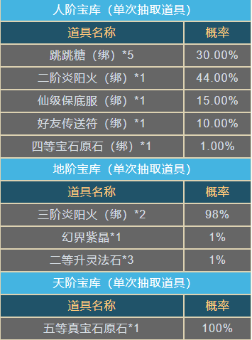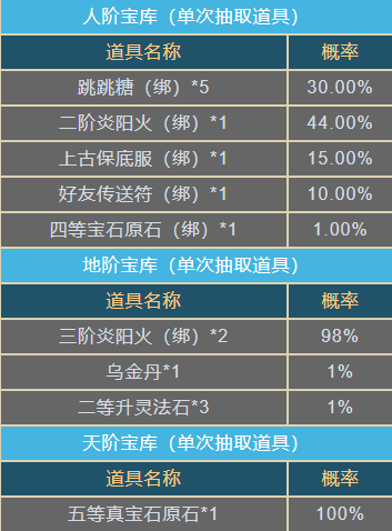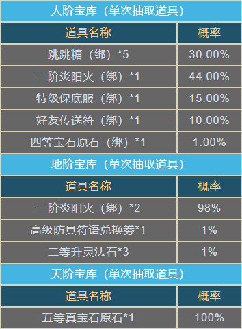 活动时间:即日起-2025年11月19日23:59 游戏内元宝消耗时间:2025年11月3日13:00-2025年11月17日10:00 探查宝库(抽奖)时间:即日起-2025年11月19日23:59分 活动内容:小妖精的密宝商店开启啦!登录账号,绑定游戏账号与区服,在三大宝库中抽出小妖精的宝贝吧!(一经绑定不可更改,同时页面也无法跳转其他区服)三大宝库分为:人阶宝库、地阶宝库、天阶宝库人阶宝库拥有:五件【奖励】地阶宝库拥有:三件【奖励】天阶宝库拥有:一件【奖励】从人阶宝库开始,每层的【奖励】每个最低探查到1个之后,即可进入下一层宝库。每探查1次人阶宝库,需要【游戏内已消费1000元宝】,宝库最大可探查100次,100次之内,每项奖励必抽到1次每探查1次地阶宝库,需要【游戏内已消费10000元宝】,宝库最大可探查20次,20次之内,每项奖励必抽到1次探查1次天阶宝库,需要【游戏内已消费200000元宝】小妖精等着您的光顾!PS:每层核算的元宝消耗与其他层不共享! 活动规则: 1、使用会员账号登录,登录后需要绑定游戏账号与区服,一经绑定不可更改,同时页面也无法跳转其他区服;2、每位玩家可以在绑定账号后,点击【刷新】,将显示11月3日13:00至刷新时间点期间的【游戏内已消费元宝】,点击【探查】,即可进行抽取宝库中的奖励,若已消耗的元宝不足,则无法抽取;3、人阶宝库可最大探查100次,每次需要【已消费1000元宝】,5种奖励必得1次。各奖励集齐1次之后,无论是否探查完100次,即可点击【进入上层宝库】,进入地阶宝库;4、地阶宝库可最大探查20次,每次需要【已消费10000元宝】,3种奖励必得1次。各奖励集齐1次之后,无论是否探查完20次,即可点击【进入上层宝库】,进入天阶宝库;5、若所有奖励已得1次,则不可在当前宝库抽取,需要点击【进入上层宝库】;6、最高阶宝库,仅可探查1次,探索本层需要已消费200000元宝;7、活动期间每个账号只可领取奖励一次,不可重复领取;8、神秘刷新、神秘购买、黑商购买、商城购买、成长计划、熟练度洗练、快捷消费(类似元宝复活)此类型消耗的元宝都计算在内;9、元宝交易与拍卖行交易等不计入消费活动内;10、奖励将于活动结束后5个工作日内统一发放。 道具抽取概率: 妙岩宫: 玉清宫: 五明宫: |