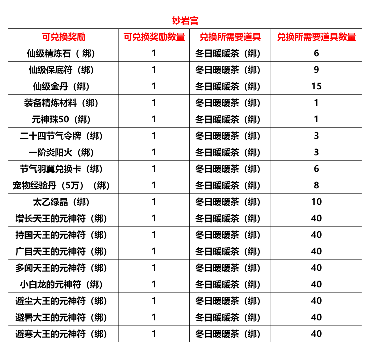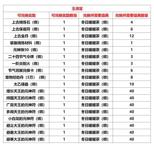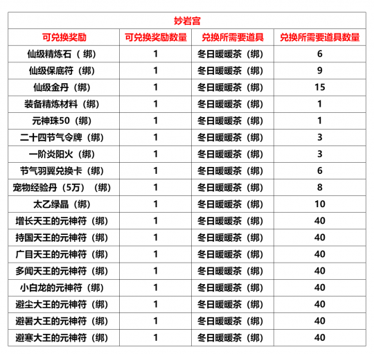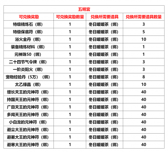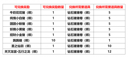 “妙岩宫”、"玉清宫"、“五明宫”,将于2025年11月10日10:00进行例行维护更新,预计更新维护时间4小时,请各位玩家互相转告提前下线。感谢大家对我们工作的支持! 竞技场第十四赛季将于2025年11月10日开启,开启后个人积分与战队积分将重置,请及时兑换相关道具。 【内容调整】 妙岩宫/玉清宫/五明宫: 1.新增任务“双十一的钻石猪” 活动等级:70级活动NPC:刷刷宝贝(133,4699 盘丝洞铁扇妹妹附近)注:该任务仅限职业“济世医仙”、“菩提尊者”可接取注:原任务这两个职业仍可接取任务内容:对目标钻石猪造成伤害200000任务奖励:三阶炎阳火(绑)*3,钻石猪猪卷(绑)*1 玉清宫: 1. 世界BOSS“天龙上仙”必掉【月恋晶】活动结束,【月恋晶】调整为概率掉落 五明宫: 五明宫巅峰势力福利: CDK:维护后开放内含:二阶炎阳火(绑)*100、欧冶子残篇(绑)*50、高级装备精炼材料(绑)*20、修炼一下(绑)*20使用时间:2025年11月10日更新维护后~2025年12月31日23:59 1.开放巅峰等级1级,开启三星斜月洞NPC灵灯道人,可以通过完成该NPC任务前往北俱芦州,开放北俱芦州相关NPC2. 开放势力等级4级3. 开放天竺国NPC布袋和尚,可以通过完成该NPC日常任务获得21级、22级技能书 4.开放四季林NPC“节气神翼使”兑换: 节气羽翼兑换卡(绑):(1)抢亲预备战“抢亲宝箱”打开之后,可概率获得“节气羽翼兑换卡(绑)” (2)BOSS? 小魔王、小喽啰、疯狂小象本次更新新增“节气羽翼兑换卡(绑)”的掉落(掉落同步玉清宫) 小暑节气羽翼:收集后可获得属性:物理伤害吸收+600、对首领伤害+5%大暑节气羽翼:收集后可获得属性:法术伤害吸收+450、对首领伤害+5% 立秋节气羽翼:收集后可获得属性:物理攻击+100、法术攻击+100处暑节气羽翼:收集后可获得属性:物理攻击+100、法术攻击+100 5. 副本加码活动NPC“突然出现”增加兑换: 【节气羽翼兑换卡(绑)*1】需要兑换道具【冬日暖暖茶(绑)*6】 【商城相关】 限时折扣: 妙岩宫/玉清宫/五明宫: 一等起星灵晶??售价:400元宝(原价:800元宝)一等升灵法石??售价:400元宝(原价:500元宝) 【BUG修复】 1. 妙岩宫修复副本“舍卫国、大战玉兔精”Boss斗战节副本豪华宝箱(绑)掉落异常的问题(副本“舍卫国”部分BOSS缺少掉落2宝箱,本周将掉落4。副本“大战玉兔精”部分BOSS缺少掉落3宝箱,本周将掉落6) 2.?妙岩宫NPC泯剑增加“高级饰品符语兑换”,部分异常“高级防具符语兑换”将于11月17日更新维护后关闭 【当前活动】 活动一:立冬节气活动(日常)任务1、有点冷,不想起床(日常)活动时间:2025年11月3日维护后至2025年11月17日维护前活动NPC:怕冷喜欢床(长安广场:2524,775)活动内容:对其他玩家使用道具【棉被】1次(日常任务)活动奖励:节气羽翼兑换卡(绑)*1、装备精炼材料(绑)*2棉被:需要完成任务【每日被窝】获取任务2、每日被窝(日常)?活动时间:2025年11月3日维护后至2025年11月17日维护前活动NPC:怕冷喜欢床(长安广场:2524,775)活动内容:每日活跃点到达150后,即可完成日常任务(日常任务)活动奖励:二十四节气令牌(绑)*1、二阶炎阳火(绑)*1、棉被(绑)*1 活动二:PVP活动节:双十一的钻石猪【日常】 活动时间:2025年11月3日维护后-2025年11月17日维护前活动等级:70级活动NPC:刷刷宝贝(133,4699 盘丝洞铁扇妹妹附近)活动内容:前往盘丝洞门口(319,4592)、盘丝洞树旁(453,4562)、盘丝洞(272,4399)对战钻石猪(造成指定数量伤害)(每日21:30~22:59在1线出现,共计出现3只),完成后到“刷刷宝贝”处提交任务。 妙岩宫:对目标“钻石猪”造成12000000点伤害 玉清宫/五明宫:对目标“钻石猪”造成2000000点伤害 小心钻石猪猪对你施法,让你变身哦! 提示:钻石猪战力不俗,建议合理搭配【组队】或者【团队】阵容后,前往挑战!提示:组队和团队模式下皆可完成任务提示:钻石猪处于盘丝洞口附近,每日仅在21:30~22:59分的1线出现,要小心!提示:BOSS复活时间很快,不要急,继续攻击!任务奖励:三阶炎阳火(绑) *3、钻石猪猪卷(绑)*1 【钻石猪猪卷(绑)】可在NPC“刷刷宝贝”处兑换: 钻石猪猪卷(绑):VIP商城上架1000元宝?限购5个 天灭龙宫·五行之龙(绑):1% 天灭龙宫·五行之龙元神符养成属性如下: 活动二:十一月PVP斗战节福利CDK福利CDK:CM115A01251103LJXTHCA9 使用时间:11月3日更新维护后~11月30日23:59内含:回复药水(绑)*50、完美修理宝石(绑)*50、丹书铁券(绑)*50、PVP活动节(绑)*1 活动三:PVP活动节:挑战副本 活动时间:2025年11月3日维护后-2025年11月17日维护前 活动内容:玩家可通过击败以下副本BOSS获得道具“斗战节副本豪华宝箱(绑)”,本宝箱只能在状态“PVP活动节”之下才可以打开 注:状态“PVP活动节”可通过使用十一月PVP斗战节福利CDK中道具【PVP活动节(绑)】获得 活动副本:妙岩宫:金顶观、舍卫国、大战玉兔精、青狮五脏玉清宫:波月洞、青狮五脏五明宫:英雄魂降真君殿、青狮五脏"斗战节副本豪华宝箱:开启礼包可获得以下道具之一妙岩宫:二阶炎阳火(绑)*2、三阶炎阳火(绑)*1、二阶玄阴水(绑)*1、三阶玄阴水(绑)*1、仙级精炼石(绑)*1、仙级保底符(绑)*1、幻界紫晶碎片(绑)*2、幻界紫晶碎片(绑)*1、幻界紫晶(绑)*1、原木树枝*1、仙阶防具勋章(概率较低)、仙阶武器勋章(概率较低) 玉清宫:皎洁的皓月之光*1、皎洁的皓月之光*2、皓月之光(绑)*1、皓月之光(绑)*2、二阶炎阳火(绑)*2、二阶玄阴水(绑)*1、上古保底符(绑)*1、上古精炼石(绑)*1、月恋晶*1(概率较低)、太上老君的柴