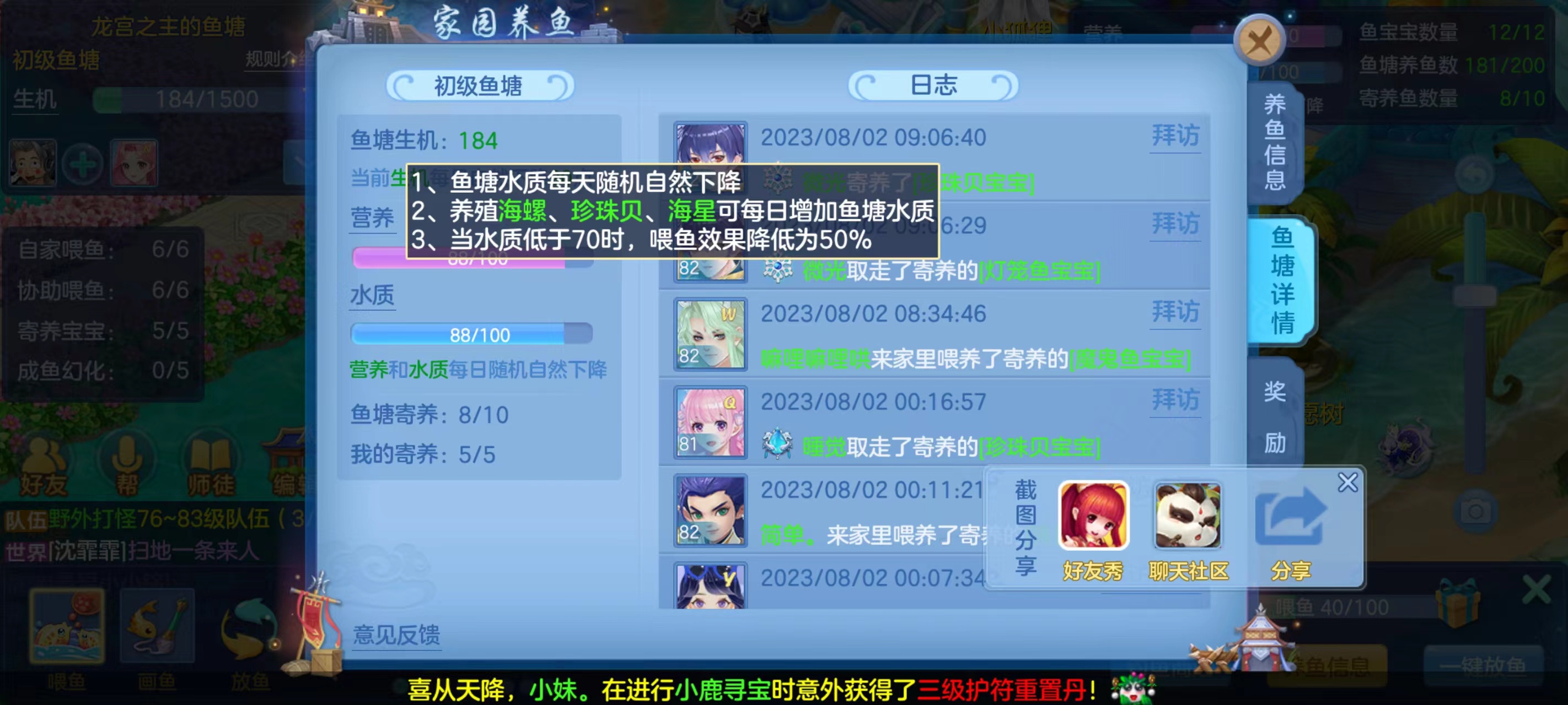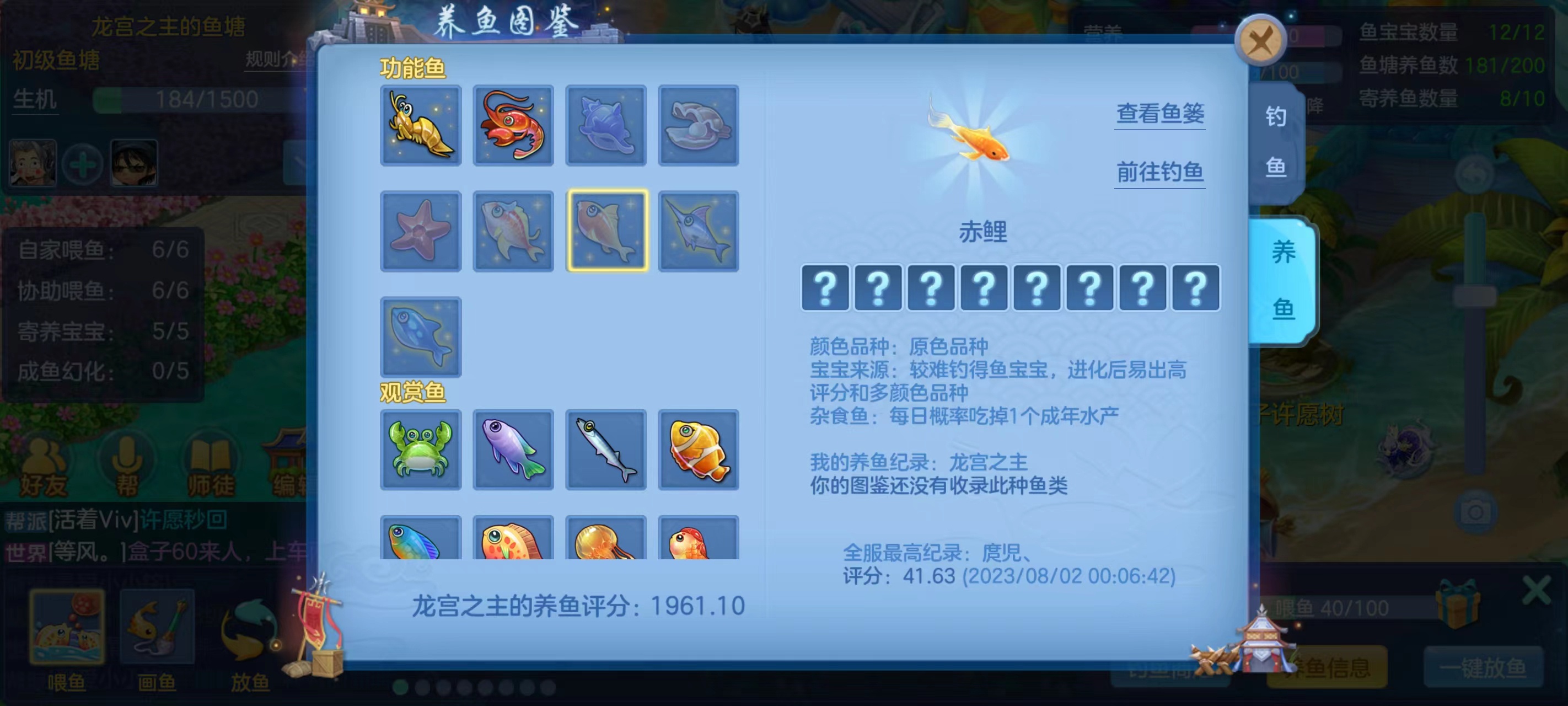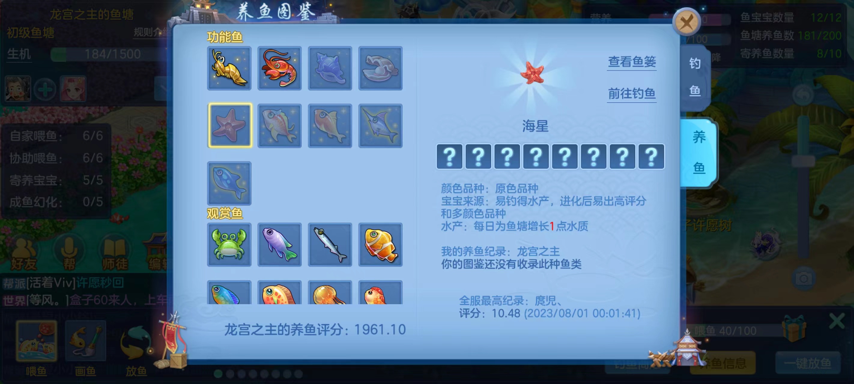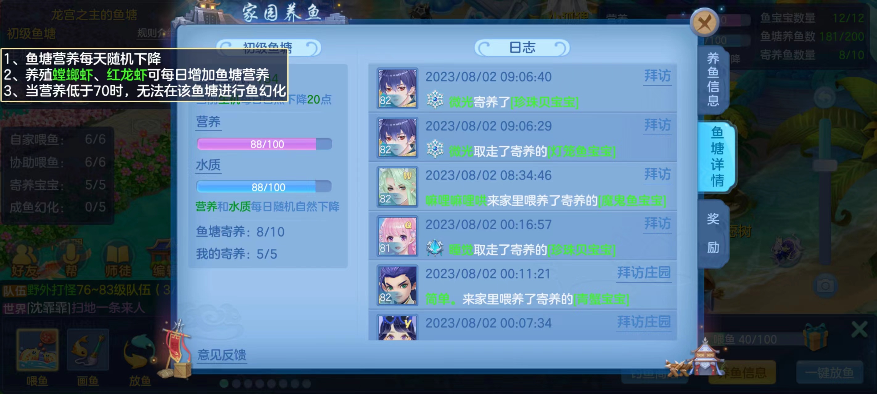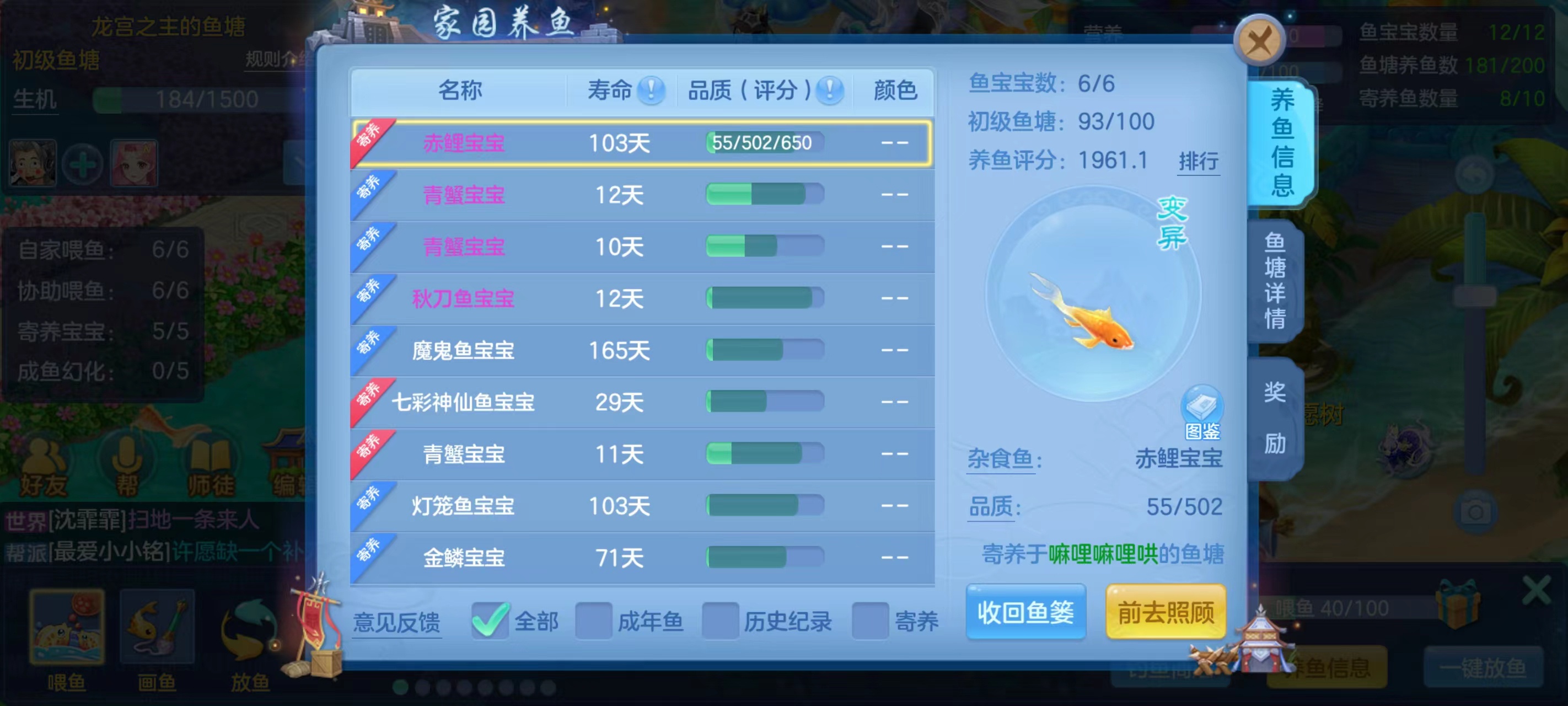 《幻唐志》手游现在养鱼增加了鱼的种类,也更加好增加评分了。 新增加了有9种养鱼图鉴,其中前两种是增加鱼塘营养的,后3种增加鱼塘水质,现在的鱼塘玩起来还得养这些新的鱼种。 不然鱼塘营养低于70无法养满品质的鱼变成成年,水质低于70喂鱼效果减半,简单通俗的来讲,就是你喂喂这些鱼,这些鱼成年了,在寿命期内,每天都给你的鱼糖增加水质和营养。 现在的鱼变得有寿命了,之前的鱼是永久寿命,如果放到别人家寄养的话就会变成有寿命的,自己家养之前钓到的鱼还是永久寿命。 还有就是新的鱼品种还会吃水产和观赏鱼。 现在鱼塘更新有利有弊,强制性你去钓鱼,鱼不得不卖,如果之前玩养鱼碰到改版养鱼分会提升不少,如果新玩家想不弄河流2000分,我个人认为太难了,我之前老区号2700分 ,没有永久河流一天就喂鱼让喂3次改版后,无法言喻,之前没改版的时候有。 河流自己家可以喂8次,现在有寄养这么一说了,寄养别人家只能寄养一条,有河流的庭院河流可以被10个人寄养。自己寄养最多寄养出去五条鱼。 还有一点我不知道是bug还是就这么设定的,自己寄养别人家的鱼,前去照顾会消耗一次自己喂鱼的次数,还喂不了别人的鱼,别人那边还不显示你去喂鱼了。如果正常去喂鱼的话,自己寄养的鱼一样会喂到。 |