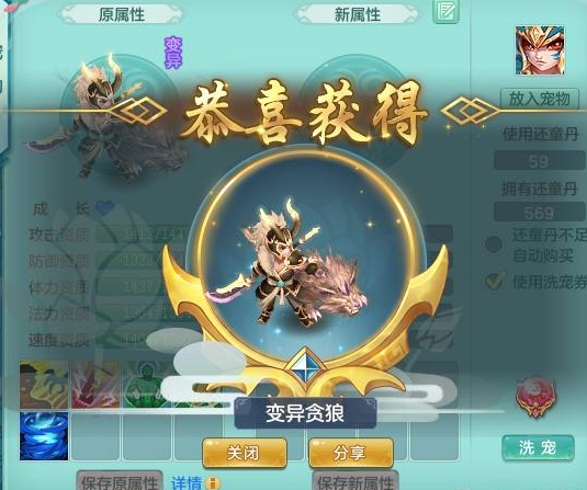 一发变异满技能,蓝心残疾狼能用吗 用了通灵符,一发满技能,但是蓝心元宵资质,不知道要不要回炉?还是直接用了?蓝心橙心差异大吗,有必要吃小灵能果? 按照129的等级来算,宝宝134级,蓝心成长1.232红心1.269,每隔一个心级差15攻击,也就是说134级的蓝心和红心差45攻击。 打日常区别不大的,橙心一样的资质攻击也就多十来点,根本没啥影响的,贪狼伤害主要还是看有没有暴击,有没有触发先锋会心。 当然,如果是拿来PK这种狼肯定是不及格的,打日常都能用。 驺吾: