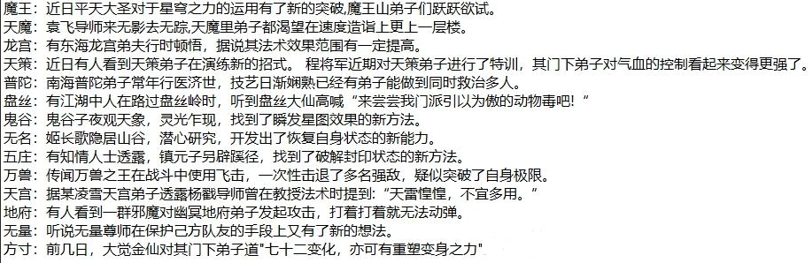 14个门派爆料内容如下,天策出乎意料的有两条爆料信息,可能其他门派也有更多的信息,大家还有更多的补充。