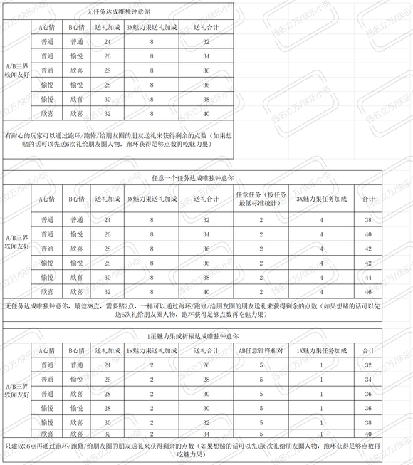 《幻唐志》唯独钟意你成就怎么获得,现在获取方式太简单了,不用特意存针锋相对任务,一天做5次,有就有没有就没有,不用那个任务一样能得到成就的。看图吧~ 跑环获得好感度亲测,我本人就是没有通过任何获得的,纯跑环给了3点拿到的~友好a欣喜:送礼8+4+8+4,b普通:6+4+6+4,这是不是最简单的。我有两个三星魅力果了,昨晚忘记吃果子,我是算出这样应该能拿,而且是最简单。 另外补充一下吃3X果子的前提: 1:两个红心互动 2:橙心和一般互动+普通任务 3:两个一般互动+两个都有普通任务(或者一个针锋相对任务) |