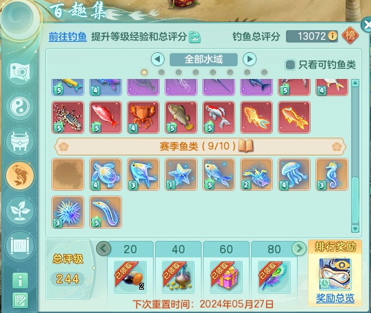 《幻唐志》最近新出的赛季鱼,0级可钓,深水浅水没有影响,鱼饵也没有影响,不用拉杆,直接上来。赛季鱼和秘宝线索一样,不需要拿到线索,只要达到某些特定条件还有一定的耐心。 各位钓友集思广益,说说自己的理解看法,早日破解线索,集齐所有赛季鱼类!!以下是我个人和一些钓友的猜测跟试验,大家有不同看法可以一起讨论 感谢笑傲江湖的 浩天ιみ 和一位不愿公开的钓鱼大神一起思考讨论验证!!还有谢谢大家一起提供线索、一起排除条件一一验证。 大概可以确定的是: 斗鲀:长安城,出现赌鬼后去擂台连胜5把,然后和赌鬼猜拳输掉 聚宝龟:长安城外,身上携带现金超过1000w 引魂鱼:桃花岛,身上带画魂放出来观看状态 幻彩海星:清河镇外,变普通鱼兵 福鲤:傲来国,普天buff,身上携带蛟龙和吉祥 七彩虾王:傲来国,天气雨后(也有钓友其他天气出 天穹水母:庭院(不确定什么条件 梦游海马:桃花岛,身上带酒,有秘宝桃花酿 漫游海胆:花果山,送灰猿两张卡片,有普通秘宝传说的鱼竿 南冥鬼鱼:庭院(不确定什么条件 庭院的具体要求不确定,大家知道的可以补充一下哦!看线索好像是对庭院还有要求,清风明月的可以去长乐小区9号试试,挺多人出过。 最后祝大家早日点亮所有海川集,天天包车!! |