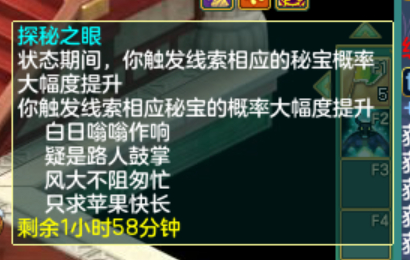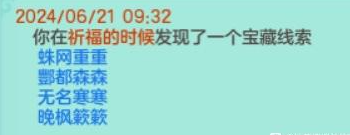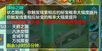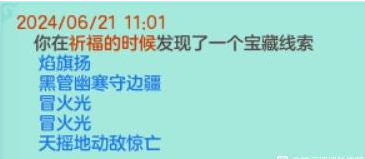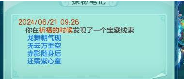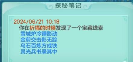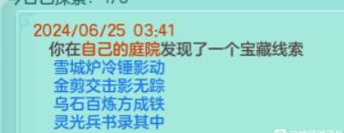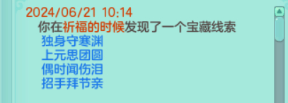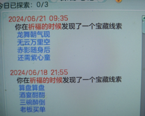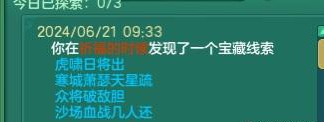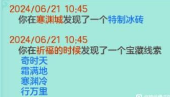 《幻唐志》目前已知秘宝的对应地点,还有其他线索的铁汁们,大家发出来一起分析分析! 1、 特制冰砖 触发地点:寒渊城【全图 】 2、稻草 触发地点:长安城外【全图】 3、胡杨根触发地点:大唐国境【全图】 4、枫叶触发地点:大唐境外【全图】 5、风化岩触发地点:乌斯藏【全图】 6、觅仙残卷触发地点:昆仑山【全图】 7、浸油火把触发地点:寒渊城守将【守将面前做挥手动作】 8、小蜜蜂触发地点:庭院【白天大风天气,庭院种苹果,人物做鼓掌动作】 9、官印 触发地点:长安城【全图,可以在官道附近多转转】 10、小风车触发地点:挖山水玄机图【区别于宝图的是这个需要手动拾取】 11、赤焰战旗触发地点:寒渊城城墙或者火堆边上【我是火堆边上触发失败,水友城墙拾取成功】 12、唤魔号角触发地点:庭院【白天晴天,把112号小伙伴魔童设为观看,然后使用龙魂灯(别人的龙魂灯,以及别人庭院放魔童是否可行待验证)】 13、水晶海星 触发地点:清河外【暂不确定】 14、熔炉之心触发地点:寒渊城欧铁心【携带灵光兵书,另外可能还需要拥有WZ秘宝金击子】 15、兽王印触发地点:万兽岭或者寒渊城【暂不确定】 除了这些,你们还有没有触发过其他的呢? |