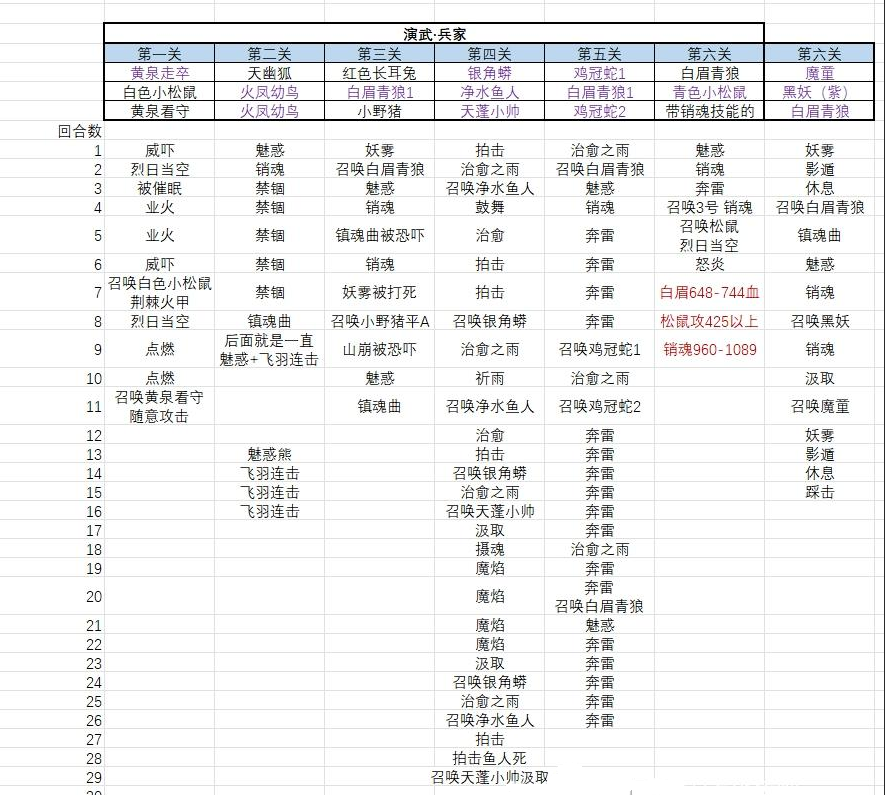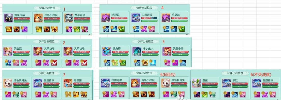《幻唐志》小伙伴演武第一关到第六关怎么打,如果经常要看教程跟着打的,建议可以收藏一下我们这个攻略,跟着表格来打就可以了,小伙伴阵容配置看这个。 需要钓鱼和庭院的小伙伴,但是不需要高级地图和挖坟,第二关失误了所以空了几个但是打起来就明白怎么回事了,第三关的白眉青狼可以在第五关重复利用,第五关没有鸡冠蛇的可以找找平替,第六关第二种打法可以拿不死成就。 如果像我一样倒霉,黑妖是橙色的,天气是雷雨天,就是这样打,可以11或者12回合妖雾,但13回合一定要是影遁。 第五关不需要青眉,2个鸡冠蛇带个雷系打第二只火羽就好了,第六关有点看天气,比如白眉销魂后给的治愈之雨,结果白眉没死 后排吃了下愈战愈勇就过不了了,还有雪天出现暴击也过不了。 |