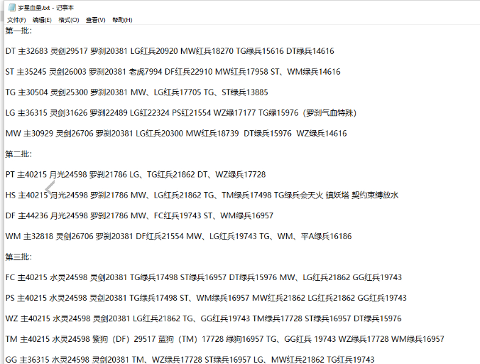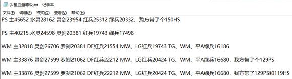 《幻唐志》最近秒升萌新开始了打岁星,因为号菜打不过所以仔细研究了各个岁星的特性配置,熟悉了对面属性和打法之后容易了很多,趁这个机会把特性和打法分享给大家。 下面每层楼都会介绍岁星的机制配置及每个门派主的打法,并且附有视频链接供参考。最近楼主自己的小奶粉119HS也拿到岁星斗转的成就了,随便上个图吧。 岁星小知识 开始正文之前,先说三个比较有趣的机制,这个应该很少有人知道,先上一张楼主收集全门派岁星怪血量的截图,这个截图收集不易,死了N次才收集全,中间也发现了一些比较有趣的现象,感兴趣的朋友可以先停在这里观察一下不同批次和门派岁星怪血量的相同点和不同点。此外楼主还收集了对面所有单位可被克制的具体情况。 关于对面可被克制单位的问题: 对面一共有四种怪,下面按类别分别说明可被克制的单位: 主:DF主:高鬼魂,可被驱鬼克制;其他主无法被克制但通常会吃BUFF从而被逆击克制。 特殊:灵剑(岁星守护):单勇敢,可被机智克制;罗刹(岁星诅咒):勇敢+幸运,可被机智厄运克制;月光(岁星君临):单勇敢,可被机智克制;水灵(岁星混沌):无法被克制;ST主的老虎(食罪妖虎):单勇敢,可被机智克制;TM主的紫狗(岁星·吠日):单勇敢,可被机智克制。 红兵:LG主的PS红兵:高幸运,可被厄运克制;FC主的红兵:高神佑,可被审判克制。 绿兵:WZ主的绿兵:高神佑,可被审判克制。 关于不同等级队伍进入战斗时对面怪的等级血量属性问题: 首先说对面怪的等级,对面的等级为己方最高等级+10,因为LG、MW、PT、HS、WM、PS、GG主LG红兵会高再生,DF主FC红兵会高再生,WM主DF红兵会高再生,所以楼主这里找了曾经的两个MW主酉鸡的录像。 第一个是5个124的,对面LG红兵再生的血量是268,也就是说对面的等级是134;第二个是129+124+124+124+119,此时对面LG红兵再生的血量是278=139*2,也就是说对面的等级是139,即为己方最高等级+10,如下两图所示。 至于怪的血量和属性,楼主用了四种不同的队伍测试了对面的血量,第一种是5个124的,第二种是3个124+一个129+一个119的,第三种是4个124+一个129的,第四种是4个124+一个150的。测试的结果如下图,可以看出对面的血量属性只和最高等级有关,只要带129PS,无论带不带119HS,对面血量都是一致的,均高于5个124时的血量,4个124+一个150的话对面每个单位血量就会高约5000左右,所以尽量要4高级带1低级,不要4低级带1高级。 至于怪的血量和属性,楼主用了四种不同的队伍测试了对面的血量,第一种是5个124的,第二种是3个124+一个129+一个119的,第三种是4个124+一个129的,第四种是4个124+一个150的。测试的结果如下图,可以看出对面的血量属性只和最高等级有关,只要带129PS,无论带不带119HS,对面血量都是一致的,均高于5个124时的血量,4个124+一个150的话对面每个单位血量就会高约5000左右,所以尽量要4高级带1低级,不要4低级带1高级。 关于对面不同门派主天兵血量属性的问题: 大家如果长打岁星,可以感觉得到第二三批岁星明显比第一批难,不光是血多,而且攻击高速度快,很多天兵加上了高厄运。楼主在收集全门派岁星怪血量数据的时候发现除了第一批岁星之外,不同天兵间的血量存在着非常微妙的联系。我们分批观察一下对面怪的血量属性关系。 我们先看第一批岁星怪的血量数据,可以观察出三个问题: 第一个是不同主的天兵血量不再有差距,比如PT主的LG、TG红兵血量都为21862,包括DF主的FC、MW红兵血量都是一致的,只有WM的DF红兵血量稍微高一些,不会再像例如第一批岁星LG主那样LG、MW红兵血量差出2650,明显勾策划做岁星的经验有了很大的提升,逻辑性大大增强,不再瞎几把敲数据。此外PT、HS、DF主天兵中两个门派中各有一个门派加上了高厄运,PT的TG红DT绿、HS的MW红TG绿、DF的FC红WM绿有厄运,WM主3红3绿和主全部有厄运,难度大大提高。 第二个是PT、HS、DF三个辅助主的罗刹血量不正常,其他的主无论是第几批除了LG之外的物免特殊怪(罗刹和带了水灵的灵剑)血量都为20381,并且多了一个特殊怪月光岁星君临,这个月光岁星君临输出很猛,威胁非常大,主怪承担了原来灵剑岁星守护释放水清、晶清、阵技、魔音等功能,此外需要注意的是这个主怪的行为和灵剑不太一样,比如有灵剑岁星守护的主,基本是第二回合必水清,隔一回合一水清,带双封的话第二回合可考虑继续封1-2个绿兵最好是封当回合必杀的绿兵,但是这三个主放水清没有什么特殊的规律,楼主一开始不知道送了这三个主好几个JQ导致灭队。 最后来看第三批岁星怪的血量数据,同样可以观察出两个问题: 第一个是第三批中所有的天兵血量只与自己的门派有关,不再与主怪有关,例如无论是什么主TM、WZ绿兵血量都为17728,LG、MW红兵都为21862,GG、TG红兵都为19743,逻辑性相比于第二批更强,勾策划做岁星的经验已经很足了。 第二个是特殊怪有变化,灵剑岁星守护的血量削弱到了第一批和第二批罗刹岁星诅咒的血量20381并且加上了物免,新增了特殊怪水灵岁星混沌,这个水灵岁星混沌其实就是罗刹岁星诅咒和月光岁星君临的结合体,血量与第二批的月光岁星君临一致均为24598,既有输出功能还会放惩戒,并且还会晶清,但是可以被封印。 此外第三批天兵不再是红绿各有一个门派有厄运,而是和颜色有关,红兵全部无厄运,绿兵除TM主的WZ绿兵外全部有厄运,并且第三批天兵的属性又加了,输出和速度比第二批的天兵还猛,并且