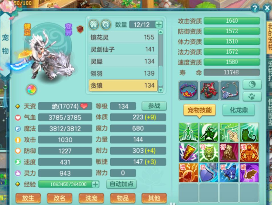 分享一只不太正经的贪狼 咱就是说,看完有一种暴殄天物的感觉,这么高的攻资拿来做法宠,号主整活成本可太高了! 贪狼当盾可以,毕竟龙也是盾。当法宠没有任何优势,技能少,法资低。洗练石,看看是不是红的六离,要配上它的身份。 变异海毛虫: