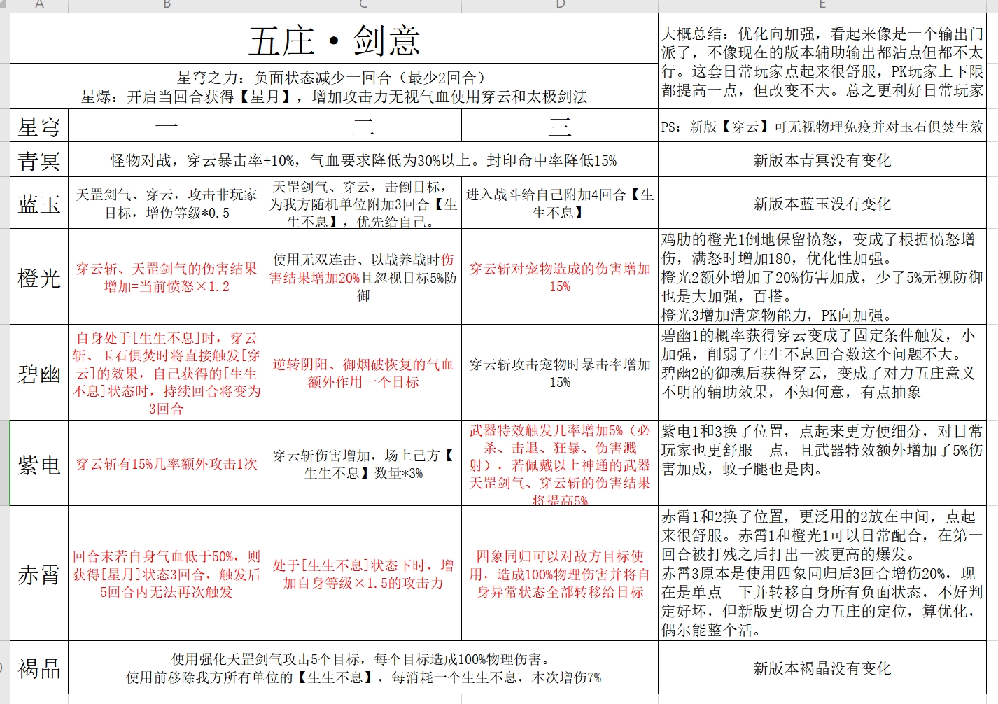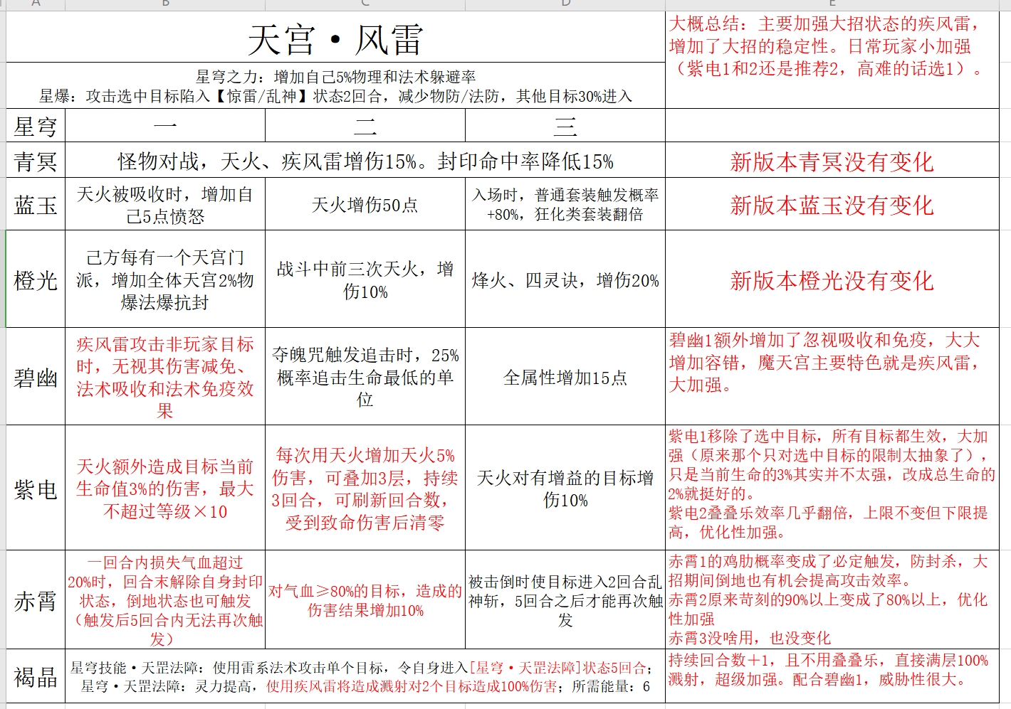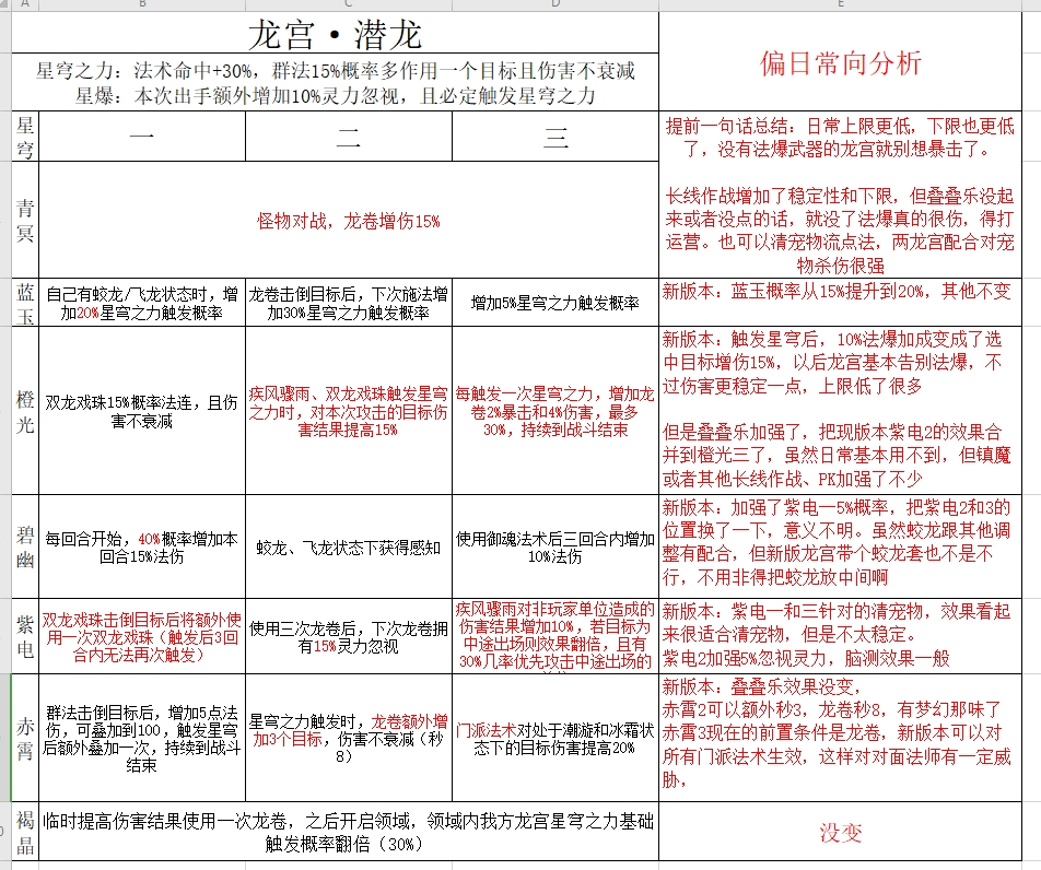 《幻唐志》来自玩家“白色拂晓”的分享,关于新版本各个门派日常,强度效率会有怎么样的变化呢? 新版本,日常龙宫玩家很难受 橙光二那个应该是对所有单位生效吧,如果只有选中单位会单独说明的,像鬼谷的紫电二群秒对选中加5%伤害之类的。 日常法系肯定天宫啊,这波更新之后就更爽了,之前叠叠乐在日常就基本没存在感,除了个镇魔几乎就根本没有叠的机会。 现在的新文本都统一了,AOE只要没说选中目标就都是所有目标生效。以前老文本没改过的地方还是很混乱,所以橙光二应该是所有目标。 新版本力五庄,日常舒适了很多 日常只能3 2 1 1 2,和现在比也就多了个穿云斩几率多打一下,并没有多大提升。看起来是真的加强了,但是碧幽一连不到紫电三真的很伤,我以前也是点15%多打一下,但是后来易成长武器换成必杀武器。 换成暴击星穹了真的香,何况改版后暴击还加强了多5%增伤,另外还有一条路线就是清宝宝增伤和打宝宝暴击了,不过感觉没有穿云香,下版本应该是蓝玉二 橙光二、碧幽一、紫电一、赤霄一 、赤霄二生生不息加攻力放弃了。 星月状态太香,赤霄一你一直半血以下实战只冷却一回合,不知道是不是bug还有星爆,星云破月几乎不会断档,而且星月状态也加攻击力。 新版本,魔天宫稳定向加强,大招极具威胁 天宫是大加强,真的一个风雷倒3个,新版本可能是仙族两大法系在争,对不起我不玩天宫了我就去玩魔王。 |