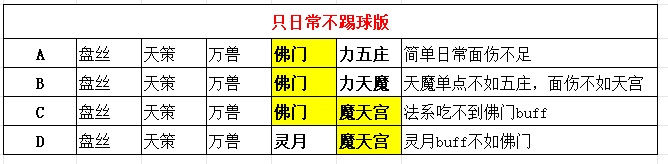 又到决赛圈了!投出你宝贵的一票! ABCD你会选哪个呢?单奶不要用灵月,恢复太低,而且日常我是觉得三辅助双狮驼就是最优解,所有都能打,简单日常带个暴力点的宝宝也不会很慢。 昨天排位赛遇到4辅助1魔天宫,魔天宫变个高驱鬼卡,地府给我们宝宝上鬼魂状态,佛门给魔天宫上法连,娘的一个疾风雷三个6000多,宝宝保命他再连一次又是三个6000多 这还能玩吗,关键普陀还能给魔天宫和地府上如沐春风,减技能cd,天罡法杖刚结束又能续上,这是哪个天才想出来的套路? 大梦胡话: