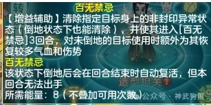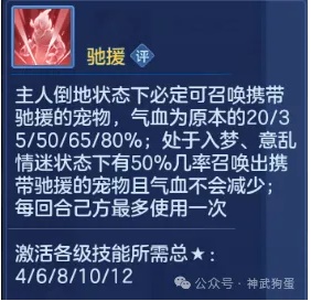 蛇年神兽技能出来啦! 手游这技能有点意思,第一条相当于手游的驰援,简单来说就是你倒地也可以召唤宠物出战。 第二条有两个效果,一是回合末能自动复活主人,应该是和百无禁忌回合末自动复活,但无法操作。这里狗蛋理解是作召唤宠物了,宠物把你复活后,你还能操作那不是一回合两个操作了,所以自动复活我更倾向不能操作。 二是自身气血随着力量或魔力提高,简单来说就是类似健魄。这里估计是不想这个神兽做盾有太大优势,如果你要做盾提高的气血就少。 看起来手游这个技能有一定战术意义,盾和输出都能做,就是不知道端游这个新神兽是不是和手游一样了。不过印象中端游的神兽技能和手游一般都不同,起码是有一些差别存在。比如老鼠,手游老鼠技能是给自身加护盾。端游则是青霜。 荷包蛋: