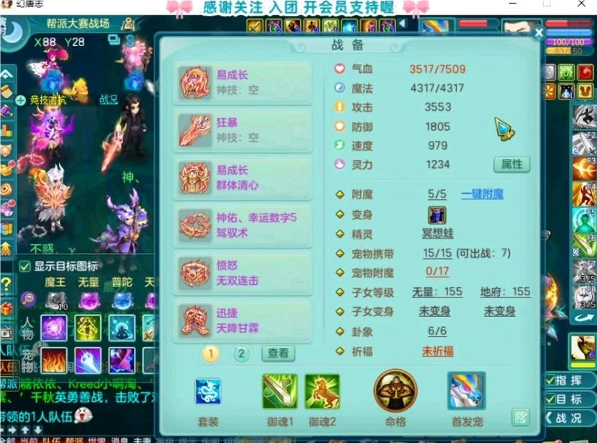 这天策什么水平? 光看红字几乎都是极品,带帮战属性不好评价,帮战是加20多速度、加30多灵力、加200多血量好像是,应该是点了紫电3,几乎全力点,这攻击面板已经很猛了! 带着饼上路: