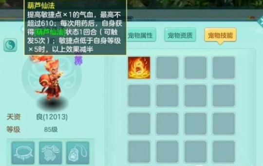 85的卡速也不错 葫芦仙法提高敏捷点x1的气血,最高不超过610;每次用药后,自身获得葫芦仙法状态1回合(可触发5次;敏捷点低于自身等级宠物属性宠物资质宠物技能x5时,以上效果减半。 原神状元: