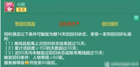 小考 回归条件改了,你怎么看?以前60天内触发一次,现在15天离线就行。但回归状态从30天减为14天。 15天就可以触发离线,我是9月初触发了一次回归,2个账号5个角色均有回归;中间又离线20多天,前天回来2个账号只有首次登陆的角色有回归,离线15天的条件肯定没变,但是不知道是不是每个号只能有一个角色触发。 |