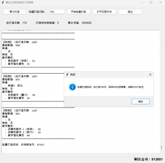 晒图人: 猪啧疯 魔fc削弱 骷髅天策可以养成了 战斗调整 (1)调整了七星方寸咒魂·极的紫电一效果: 新效果:攻击拥有符印的目标,恢复5点愤怒,每回合最多触发2次; 原效果:攻击拥有符印的目标,恢复5点愤怒。 (2)调整了魔王山赤火·极的碧幽二效果: 新效果:使用天崩地裂和星火燎原攻击时有40%几率附带[魔法毒]4回合 原效果:使用天崩地裂和星火燎原攻击时有30%几率附带[魔法毒]4回合。 (3)调整了鬼谷纵横·极的赤霄三效果: 新效果:每攻击6个不同的目标后获得[星图]状态3回合,触发后重置(已处于[星图]状态时无法获得); 旧效果:每攻击7个不同的目标后获得[星图]状态3回合,触发后重置(已处于[星图]状态时无法获得)。 晒图人: 恋恋风尘 用AI瞎写的刷装备模拟器,试试理论上多少钱可以刷出“倚天剑” 理论极限武器真的存在是最吓人的只能说,最近好多刷装备的老板,包括抖音直播也看了不少,老板马力拉满,可惜结果总是棋差一着。 群里也很多小伙伴在讲这个武器还可能再刷出来吗,我的观点是这个东西该有就是有(打造成就一千件之前出),不给你的时候刷到老都出不来。 基本参考面从官方之前发出来的公式文件做底层,打造神技的概率16%,每打造8次保底必定出特技。神通概率4%,并且区分3类神通,独立算概率,可能同时出现。 然后就是批量瞎跑了,运气很差,跑了一百五十万次打造才出现一把可以追猫哥尾气的武器,假如平均按90块钱一把的话,大概需要硬刷一点三五个亿。 晒图人: Justin 能不能把罗成算卦还回来呀 以前的罗成是真帅,模型迭代没有一个迭代成功的,都是败笔!主要是动作比较好看,不过现在的也不错。完全可以在以前模型的基础上进行重新绘制,这样既能翻新又能保留以前的感觉。 |