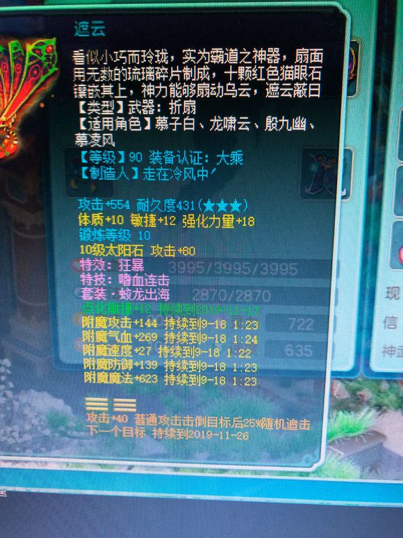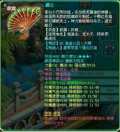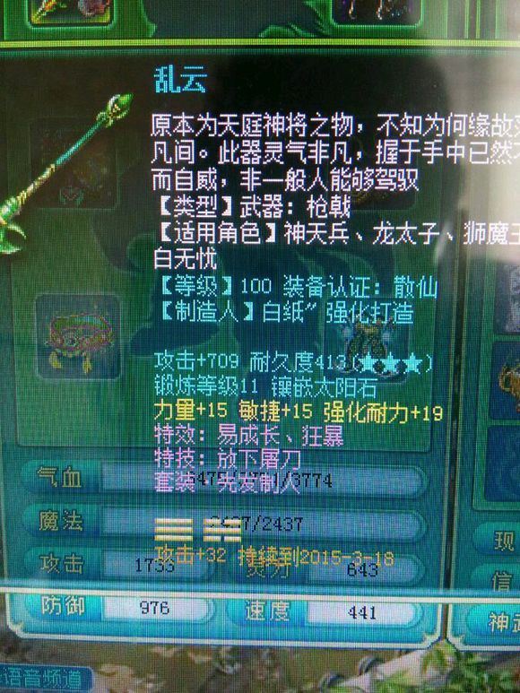 首先带来的是一把90武器,攻击接近上限,双加属性,特技特效也不错