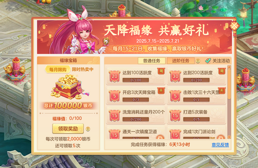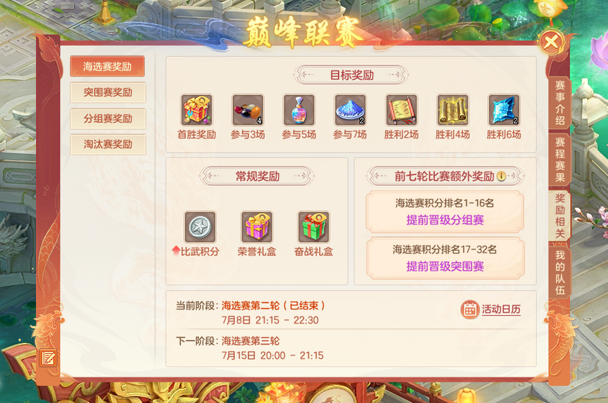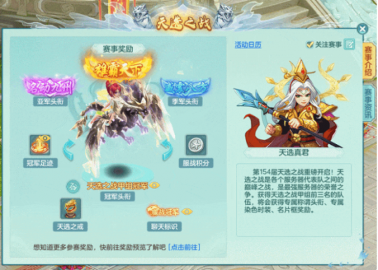 《幻唐志》全民竞技巅峰联赛第三轮今日开启,甲组天选之战新增冠军坐骑! 全民参与 巅峰联赛火热进行中 巅峰联赛将在今日开启,所有50级以上的少侠均可参与!?无论输赢都能获得比武积分、荣誉礼盒等奖励。累积胜利场次,更能解锁山水玄机图、高级魔兽要诀、域外寒晶等丰厚奖励!期待各位少侠的精彩表现,让我们一起在巅峰联赛中创造属于自己的巅峰时刻! 天选之战冠军新增坐骑奖励 为服务器荣誉而战 第154届天选之战将在7月18日正式开战!本次天选之战的甲组冠军奖励再升级,夺得甲组冠军的队伍可获得荣誉坐骑“帝霄”,多次获得冠军还能解锁更多主题风格的坐骑。在这场最强服务器的荣誉之战中,各位少侠尽情展现你们的实力与智慧,为自己和服务器赢得无上的荣耀吧! 十万银币等你来领 活跃领满技能宠物 天降福缘活动如期而至,少侠日常活跃完成福缘任务能够赢取10万银币好礼,还有限时优惠、天官试炼等惊喜活动。 除此之外,还有盛夏宝库、夏日活动和幻唐赠礼等活动正在火热进行中,日常活跃即可领取强力宠物、神兽之灵,高级魔兽要诀等丰厚奖励,多重福利,畅玩一夏! |