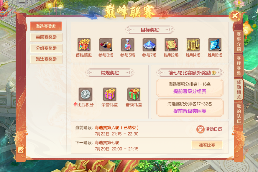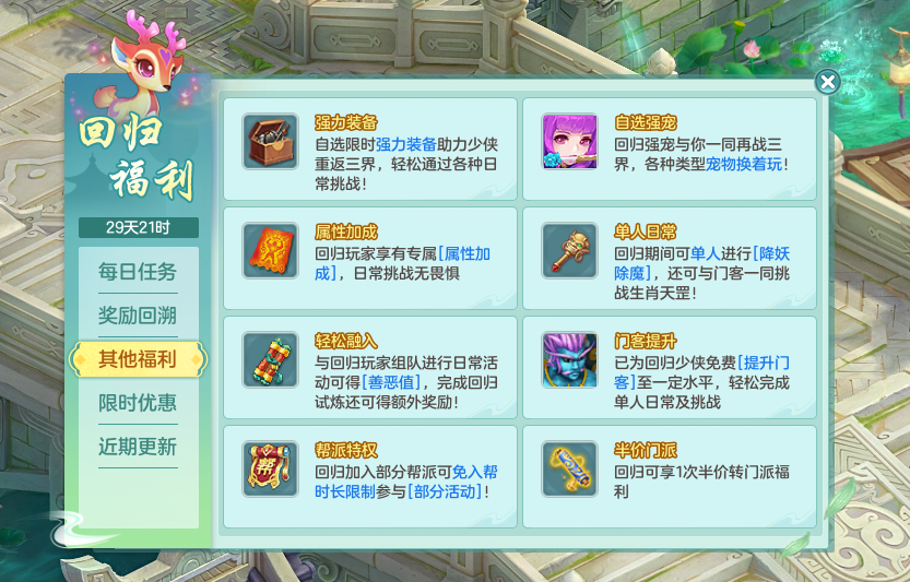 本周更新提纲 1. 巅峰联赛海选赛最后一轮 2. 回归福利加码 3. 部分玩法调整 4. 新服“烈火流金”即将开启 5.其它内容调整 【巅峰联赛海选赛最后一轮】 (1)巅峰联赛正在火热进行中,7月29日将举行最后一轮海选赛,少侠可组成5人队伍前往监军使处参与,赢取丰厚奖励; (2)第七轮海选赛结束后将根据排名决定晋级分组赛与突围赛的名额,排名33-128名的少侠仍需继续参与海选赛加赛,竞争最后的突围赛名额。 精彩对战不容错过,比赛开始后,各位少侠可在观战大厅观看选手对战直播! 【回归福利加码】 (1)新增转门派福利,长时间未上线错过半价转门派机会的少侠,可享受一次半价转门派优惠; (2)提高了奖励回溯期间的威望获取上限。 希望少侠们在回归后可以快速玩到自己喜欢的门派,官职和威望的追赶也更轻松~ 【部分玩法调整】 法宝系统 (1)招财礼券积分商店8月1日0点刷新后,将上架每月刷新的法宝灵晶礼包; (2)缩短了法宝引导任务; (3)法宝图鉴界面增加关注法宝功能,积累较多法宝灵晶、灵元时将提醒兑换或注灵。 签到好礼 (1)签到好礼活动调整为全服范围内,角色升级至15级时开启; (2)移除了主线、提升等级等获得青瓷姬的方法,后续只能通过签到好礼活动获取; (3)角色等级≤30级且未领取青瓷姬的老服角色在本周维护后将加开签到好礼活动; (4)青瓷姬技能解锁规则调整为:80金币解锁一个随机低级兽诀技能。 【新服“烈火流金”即将开启】 新服“烈火流金”将于7月25日10点正式开启,现已开放角色预创建,进服快人一步! 新服将加开幻唐赠礼活动,领取高级魔兽要诀、通灵符等奖励;累积活跃还能获得不同程度的转门派折扣,最终可免费转门派。更多丰富福利与玩法期待少侠们进入新服体验! 【其它内容调整】 短语优化 (1)短语系统:可根据当前发言智能联想组队相关短语,无需输入活动名; (2)指挥短语:优化了相关界面与功能。 其它调整 (1)降低了除魔任务队长经验奖励加成; (2)维护后至8月10日,重新开放3条限时鱼类,感兴趣的少侠可在各地渔夫处打听线索并钓得收藏; (3)洗炼珠的名字调整为小洗炼珠,功能不变。 *以上是慕子白带来的最新资讯* *最终效果可能会有所调整* |