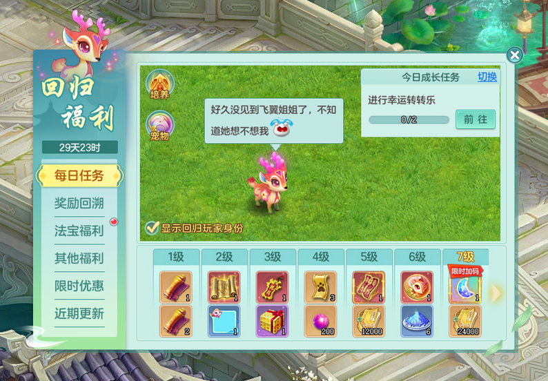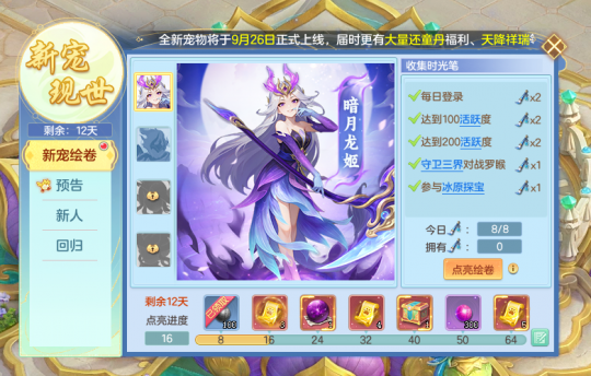 《幻唐志》回归福利内容加码,新宠绘卷领培养道具,全新宠物即将上线,金秋大服“山河盛世”预约即将开启,领全新萌宠,享多种好礼! 回归限时加码得免费星穹点 回归加码福利现已开放领取,在一定时间未登录的少侠回归即可免费获得星穹点。此外,在组队挑战十二生肖和三十六天罡时,怪物强度会降低,挑战更轻松,助力畅玩三界! 回归登录即可领取专属好礼,包含强力装备、强力宠物、属性加成等丰富奖励。在近期一段时间未登录活跃的玩家,可享高级礼券立减30福利。 满足条件的回归少侠还有半价转门派福利,让回归少侠能够体验到其他门派的特色内容。 全新宠物震撼来袭金秋佳节领好礼 新宠绘卷活动现已开启!少侠可通过日常活跃和限定活动来解锁四只全新宠物的形象,还能获得还童丹、重塑券和神兽之灵等好礼,助力少侠洗宠培养。 全新飞升145级新宠暗月龙姬、飞升125级新宠九幽魔将、105级新宠飞羽、85级新宠赤炎童子将于9月19日正式开放捕捉和预洗宠,少侠可前往新地图“永冻冰原”捕捉并洗宠培养。 金秋佳节将会有盛典赠礼、天降祥瑞、吉祥小铺等系列活动来袭,少侠敬请期待! 金秋大服即将上线萌宠福利享不停 全新金秋大服“山河盛世”将于9月26日正式上线!明日将开启预创建,官网预约活动同步开启,免费领取全新双特殊萌宠,并进修为珍兽成长。还有萌宠专属表情包盲盒和各类珍稀道具等待少侠前来体验! |