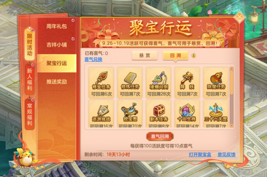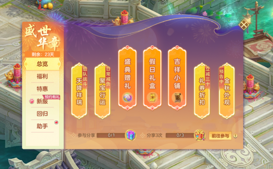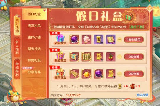 《幻唐志》活动汇总:活跃领全高书新宠!盛世华章系列活动9月26日开启,那么国庆中秋幻唐志有什么活动呢?我们一起来看看总结。 盛世华章系列活动欢度金秋佳节 少侠参与盛典赠礼活动,只需完成日常活跃任务即可解锁神兽之灵、鸿运宝箱等好礼;持续活跃累积进度,还能获得全高书宠物自选等珍贵奖励! 组队参与天降祥瑞活动,挑战成功有机会获得神兽之灵、三级护符重置丹等稀有奖励,还有机会捕捉到变异宠物和变异新宠物。 假日礼盒活动陪伴少侠畅玩假期!多种假日礼盒供少侠挑选,购买立享高级魔兽要诀、洗宠强化符等好礼;假日期间只需登录即可领取神兽之灵等后续奖励,轻松领福利! 聚宝行运活动期间,少侠每日活跃获得的喜气值可用于悬赏任务,假期还可以回溯奖励,助力少侠假期游玩更加轻松便捷! 还有聚宝盒限时折扣、吉祥小铺返场 、礼券折扣和双人坐骑云麾铁骑、万物生限时返场等众多金秋佳节活动等待少侠前来体验! 全新宠物登场预洗宠活动火热进行中 五只全新宠物现已开启预洗宠,少侠可前往新地图“永冻冰原”捕捉并洗宠。9月26日可进一步打书、洗炼,届时全新65级新宠“紫金炉”同步上线。其余四只新宠10月10日可携带出战。 少侠可参与新宠绘卷、冰原迷影活动领取重塑券、还童丹等洗宠道具,日常任务有概率遇见宝藏鸟,成功捕捉后也可获得洗宠道具,助力少侠洗宠培养。 金秋佳节“盛世华章”系列活动9月26日上线届时金秋大服“山河盛世”同步开启多种福利活动内容陪伴各位少侠欢聚金秋! |