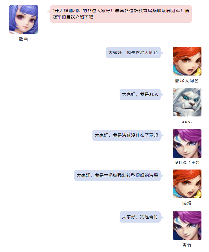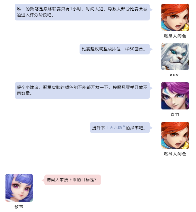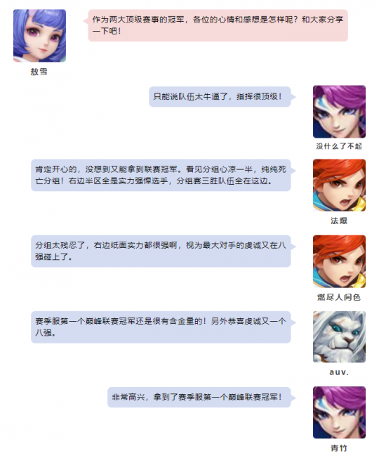 本届冠军采访到这里就结束了,祝愿大家在以后的赛事中都能取得好成绩!也让我们一起期待下届巅峰联赛的到来见证更多激动人心的时刻!