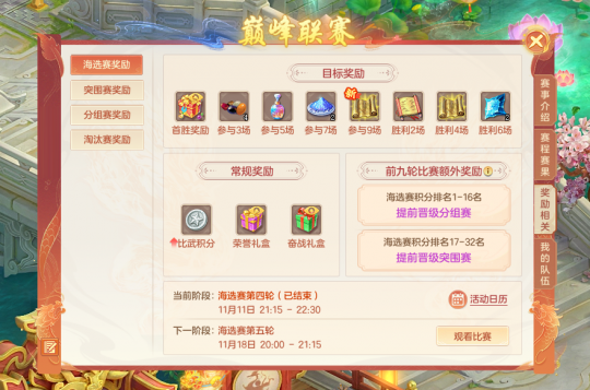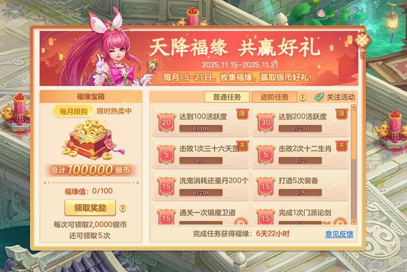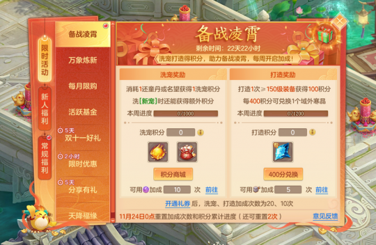 幻唐志本周维护更新:洗宠打造得积分,助力备战凌霄,周末见证天选之战年度冠军诞生!接下来给大家梳理一下本周更新的核心内容: 本周更新提纲 1. 备战凌霄活动开启 2. 天降福缘如约而至 3. 回归专属副本 4. 多项赛事火热进行中 5. 新服“凌霄斗法”预创建进行中 6. 其它内容调整 【备战凌霄活动开启】 维护后至12月7日,将开启备战凌霄活动。期间进行洗宠和打造装备操作可获得相应积分,积分可用于兑换固神丹、元宵礼包、装备之灵等好礼。 此外,云涌之际系列活动火热进行中,少侠可继续参与获得全新法宝限时体验、稀有推荐信(转门派折扣券)、神兽之灵等好礼! 【天降福缘如约而至】 活动将在11月15日(周六)开启,21日前均可完成福缘宝箱任务,赢取10万银币奖励。 【回归专属副本】 维护后至12月12日,满足一定条件的回归少侠可在回归成长任务中获得时空秘卷。同长安城的时空帝王对话可进入时空秘境,与其他少侠组队完成挑战即可获得时空宝藏。 时空帝王不仅是炫酷的机甲风格,还携带丰厚宝藏奖励!少侠们快邀请好友回归一起挑战吧~ 【多项赛事火热进行中】 2025天选之战冠军联赛开战 (1)双败淘汰赛将于11月15日-11月16日进行; (2)总决赛将新增门派禁选流程。 年度冠军将在本周末诞生,让我们拭目以待! 第3届巅峰联赛火热进行中 11月18日将举行海选赛第五、第六轮比赛,少侠可组成5人队伍前往长安城监军使处参与,赢取丰厚奖励! 【新服“凌霄斗法”预创建进行中】 大闹天宫主题新服“凌霄斗法”将于11月21日10点正式开启,现已开启角色预创建。 经典玩法“大闹天宫”回归,入驻新服抢先玩!主题萌宠“如意灵猴”签到领,使用累充道具进修有概率进阶为神兽孙小圣!还有主题副本“营救大圣”、花果山与天庭的阵营对抗以及帮派之路等一系列大闹天宫主题玩法等待各位少侠前来体验! 【其它内容调整】 官方助手支持更多功能 (1)支持一日千里活动; (2)支持结婚系统; (3)支持装备回收人出售装备、限时装备类型转换; (4)支持子女进阶技能转换。 登高探宝 (1)支持了组队匹配功能,活动准备阶段—活动结束前可进行匹配组队; (2)服务器等级达到95级后,可进行跨服匹配,跨服队伍将不纳入活动排行榜中。 观战大厅 天选之战、启明之战的录像新增服务器信息。 *以上是慕子白带来的最新资讯* *最终效果可能会有所调整* |
