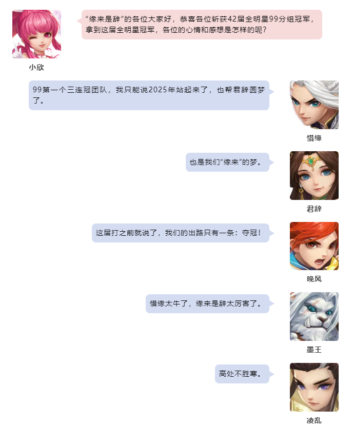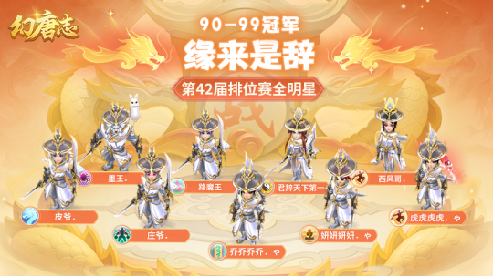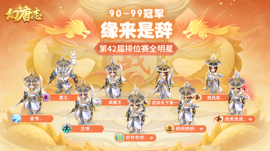 幻唐志第42届排位赛全明星各个分组赛事,首先让我们恭喜“缘来是辞”队一举摘下42届90-99级分组的桂冠!今天邀请到了他们接受采访,一起来看看。 90-99级分组 缘来是辞队 本次采访的团队成员有: 东海龙宫-小皮(2025全明星三连冠+三连亚) 凌霄天宫-庄可爱 盘丝岭-墨王(两冠五亚) 镇元五庄-君辞(双破甲五庄) 七星方寸-晚风(五届决赛三次夺冠) 天策-小虎(年度全明星、巅峰联赛双冠军) 无量-楚言大帅哥 天魔里-西风哥 无量-路魔王 除此之外还有: 惜缘 小鱼 凌乱 小见 老龙 本届冠军采访到这里就结束了,祝愿大家在以后的赛事中都能取到好成绩! |