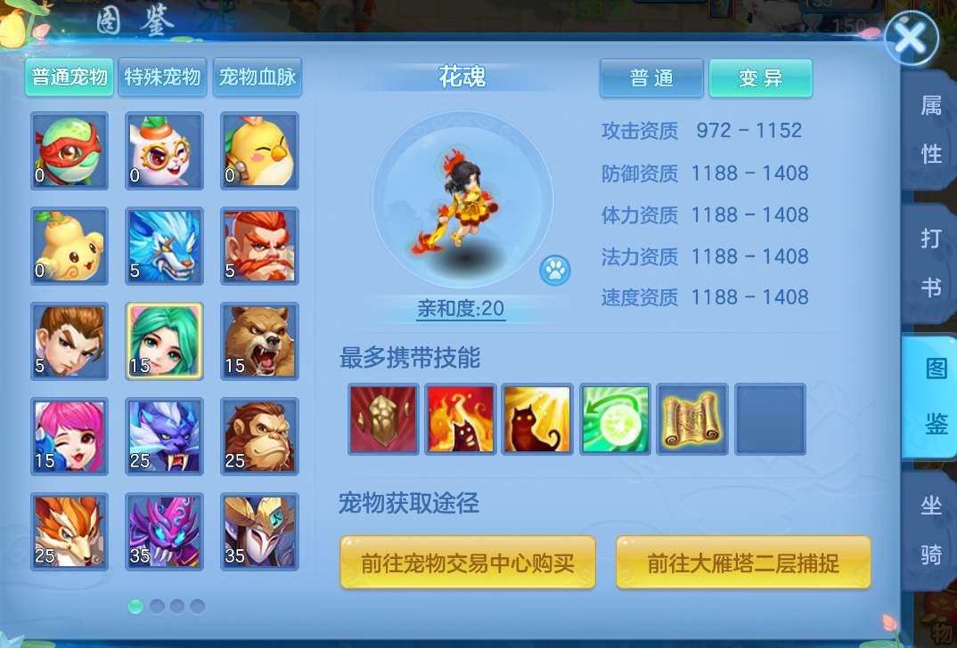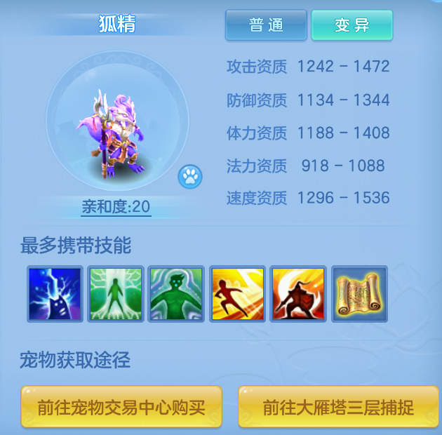 在《神武4》手游世界的修行中,宠物是少侠不可或缺的战斗伙伴,神武世界中包含各色各样的宠物。 宠物其实和人物定位相似,也有着输出、辅助等作用,其中输出又分为攻宠和法宠,还有些宠物由于其抗性高,常作为药宠。 而宠物也有其优劣之分,少侠可能会经常听到的“某某洗了个满技能红心宠”也是出于这个原因。 野生宠物与宝宝 宠物好坏,最直观的就是野生与宝宝的区别,野生宠物的加点是随机性分配好,并且技能搭配等仅是图鉴中已有的技能,难以满足任务需求,不值得培养。 而宝宝又有普通宝宝与变异宝宝的区分,在资质与技能数量上都有差别,这点无忧会在后面的文章中详细介绍。 此外,宝宝的优劣由其成长、资质与技能共同决定。 Part 1 成长 无论哪个阶段的宠物都是由红心、紫心、橙心、蓝心、绿心等五个成长梯级,其中红心对应成长最高,绿心对应成长最低,而成长影响着宠物加点时带来的面板属性的提升。 Part 2 资质 每个宠物对应的资质上限是有区别的,这点可以在图鉴上可以看到。 比如变异宠物的幽魂,攻击资质在1350-1600之间,也就是其资质在1350以上,1600资质以下,资质同样影响着宠物的面板。 图片 Part 3 技能数 一个宠物最多携带技能数为图鉴所示,如蛟龙,普通蛟龙最多可携带5个技能,普通花魂最多可携带4个技能。 这也是《神武4》手游的一大特色,无论是何人,宠物最大技能数也无法超过图鉴上显示的,也不存在将两个宠物“合体”之类衍生出更多技能宠物的机制设定。 上面提到了普通宠物携带的技能数,除此外,还有变异宠物。 最直观的感受是变异宠物的颜色外观与普通宠物完全不同,并且变异宠物在原有基础上资质上下限会提高,技能数也有概率会多一个。 所以获得高资质(红心)、高成长(多项资质达到上限)、满技能变异宠物一直是许多少侠梦寐以求的。 Part 4 如何获得自己喜欢的宠物 其中宠物又分野生宠物与宝宝,野生宠物都是普通宠物,所以很少会用野生宠物陪伴自己战斗,故而需要获得宝宝。 1.野外捕捉 在打怪双倍处,可以看到宠物所在地,与暗雷怪(不开启驱魔香到处走动时会遇到)交战时,有几率遇到宝宝。 2.还童丹洗宠 打开长安地图,可以寻找到交易中心,点击宠物交易中心npc购买想要的野生宠物。 这时需要用身上的还童丹进行洗宠,洗的宠物必定是宝宝,并且有概率成为变异宠。 其中等级越高的宠物洗宠,所耗费的还童丹数量越高。 注:在洗宠物的时候,可以配上洗宠券秘方,有概率提高宠物资质上限,并且消耗还童丹数量减半。 因为变异宠物弥足珍贵,《神武4》手游中还配有通灵符,可使变异宠物在重置资质和技能时仍旧是变异宠物。 这样一来,获得高资质、高成长、满技能的宠物相对会更容易一些,有保底机制噢,无忧也祝少侠洗出满技能红心宝宝~ 以上就是本期认识宠物资质、成长、技能,以及如何获得宝宝的攻略,无忧下期会讲解如何获得判断宠物的类型等。 编辑:ssc