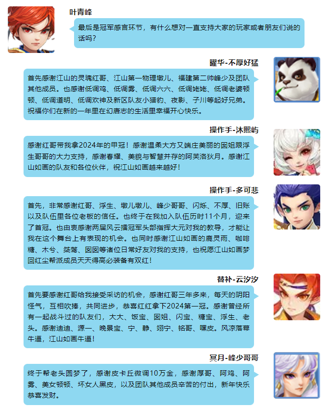 在《幻唐志:逍遥外传》手游第101届天选之战当中,江山如画2队披荆斩棘,最后在与神来气旺1队的比赛中赢得胜利,最终夺得本届天选之战甲组冠军,恭喜他们! 战队简介 战队名称:江山如画2队 战队荣誉:第101届天选之战甲组冠军 战队构成:一封、一奶、两物理、一法 不厚好猛(曜华城)、明年今日(无量)、峰少哥哥(冥月天)、墩儿墩儿(万兽岭)、糖小仙女(武侯府) 编辑:ssc