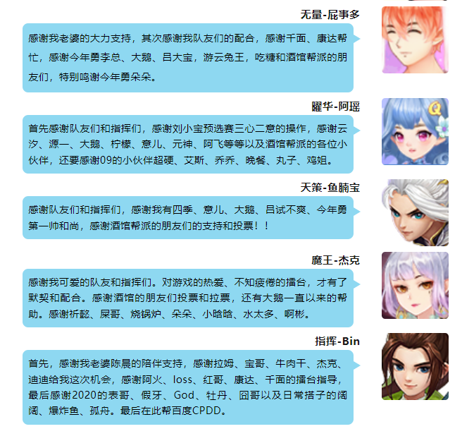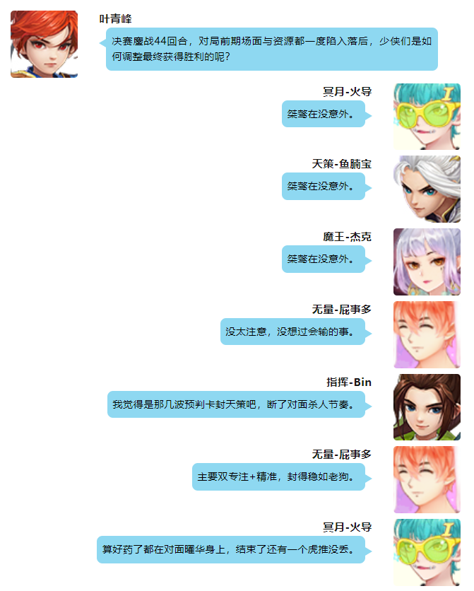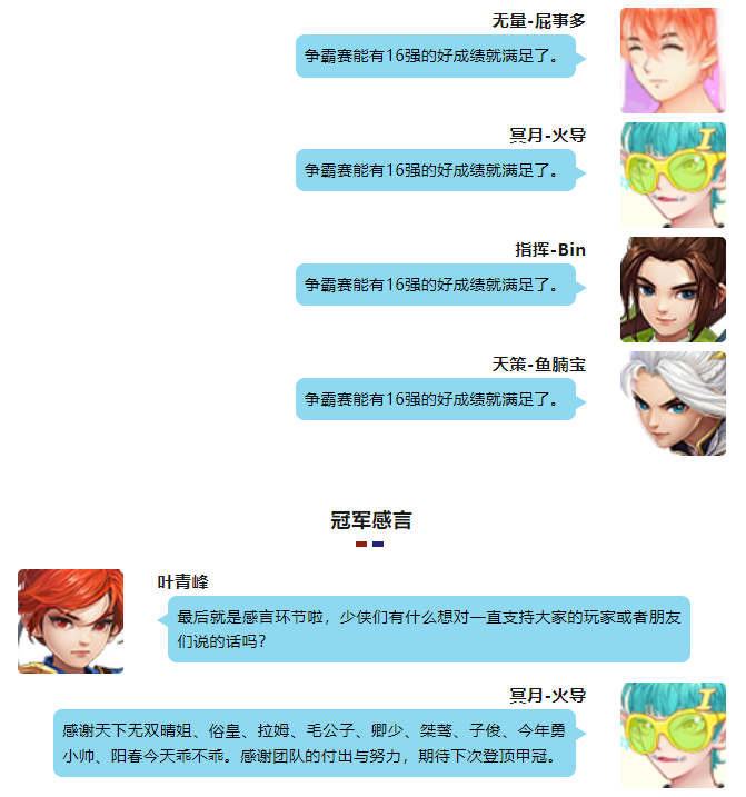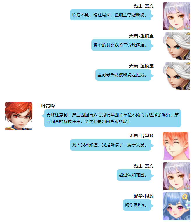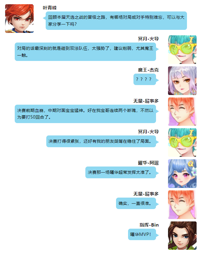 在《幻唐志:逍遥外传》手游第104届天选之战当中,今年勇5队披荆斩棘,最后在与江山如画5队的比赛中赢得胜利,最终夺得本届天选之战乙组冠军,恭喜他们! 【战队简介】 战队名称:今年勇5队 战队荣誉:第104届天选之战乙组冠军 战队构成:一封、一奶、两物理、一法 阿瑶(曜华城)、屁事多(无量)、拉姆(冥月天)、鱼腩宝(天策)、杰克(魔王山) 编辑:ssc