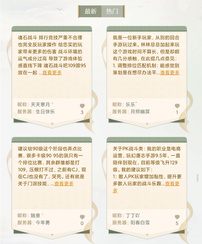 《幻唐志》手游线上交流会议题征集活动已经在上周五开始啦,少侠们提了不少PK战斗类的议题一起来看看吧! 游戏pvp环境差,找不到队或者队友 玩家的流失导致目前游戏环境越来越差,我有好多好友都是找不到队伍pk,有的好友已经因为区内没不到人pk,选择换服。 建议:开服到一定时间,可以选择互通到四个新大区(青龙白虎朱雀玄武战区),四个区内所有玩家都是109玩家,只要升级就会进入新的战区,战区内搞帮战赛,战区赛,给予战区内帮战第一的帮派每人每周一定奖励。每个战区开展战区赛对战其他战区。其他等级段同理 加强服务器内互动性,没有乐趣 更新比武和魂石活动。目前魂石都是找个队伍挂机,比武也是挂机多,俩人进场且是跨区匹配,缺少区内互动性,队伍之间强弱差距大,没有乐趣。 我的建议是:回归以前的老比武,区内人分俩阵营,自己组队pk。由于人数不够可以将95和109平衡属性到105。飞升后玩家,可以平衡属性到飞升135。这样人数也够,和认识的人不管输赢都更有意思。 优化匹配机制,优化阵法乱敏机制 周六周日增加排位赛类型比赛活动,优化匹配机制让势均力敌的对战情况多出现一些 优化阵法速度及乱敏机制,有时候超过90都会乱敏就显得很不专业,个别或者全部门派战斗调整后(星象,技能,加成等)多加开半价门派转职让玩法更丰富。 多统计各类比赛活动的各门派数据,适当调整门派强度及加成让各职业都有上场的机会 以上仅为本人的观点意见,祝幻唐志越来越好。 冥月天机制优化,小妖侵蚀不了丹山 自从冥月天的出现丹山这个门派直接灭门,别人的星象都是对自己或者队伍有作用的,而丹山的星象还需要去针对冥月天小妖的侵蚀而学,这不就是等同于浪费一个星象了?不学面对冥月天还很无力。 学会吸收新玩家,尊重老玩家 不要过度引导老玩家选择。我想说存在即合理,如因为收益限制退游的霸主玩家和95玩家。现在我很多109的朋友因为找不到队伍选择退游。现在09人已经很少了,不希望策划过分引导升级,不然09退游的人会越来越多。 对策:多搞搞营销,冠名综艺和明星引流,可以请流量明星代言,相约夏天,畅玩pk。玩希望有新血液进来,游戏才有未来。 竞技场等级段,分组十分混乱 例如:盟主【96-115】,尊主【116-125】,雄主【126-140】,像09,129的玩家,竞技场完全没有可玩性,如果129还算尊主的话,竞技场和140级在一个分段多少有点离谱了,09与115在同一个分段,115拥有巨大的等级和装备优势,所以希望能提高09和129卡级玩家的竞技场体验。 血脉天赋,能不能出保底机制 关于血脉天赋,希望能出一个保底机制,消耗材料达到上限,可以指定一种专属天赋,这样也能提高玩家对血脉玩法的积极性。 装备特效调整,互相进行转换 装备特效上,希望部分特效能像特技【烽火连城】【嗜血连击】一样,能够进行转换,例如【狂暴】可以与【法术紊乱】互相转换,或者【必杀】与【狂暴】之间的转换等等,不仅可以大幅度降低玩家的装备打造成本,还能提高玩法多样性。 以上是来自玩家的各种建议,当然还有其他更多意见没有列出来,对于PK战斗类调整,你有没有其他想法呢? 编辑:ssc