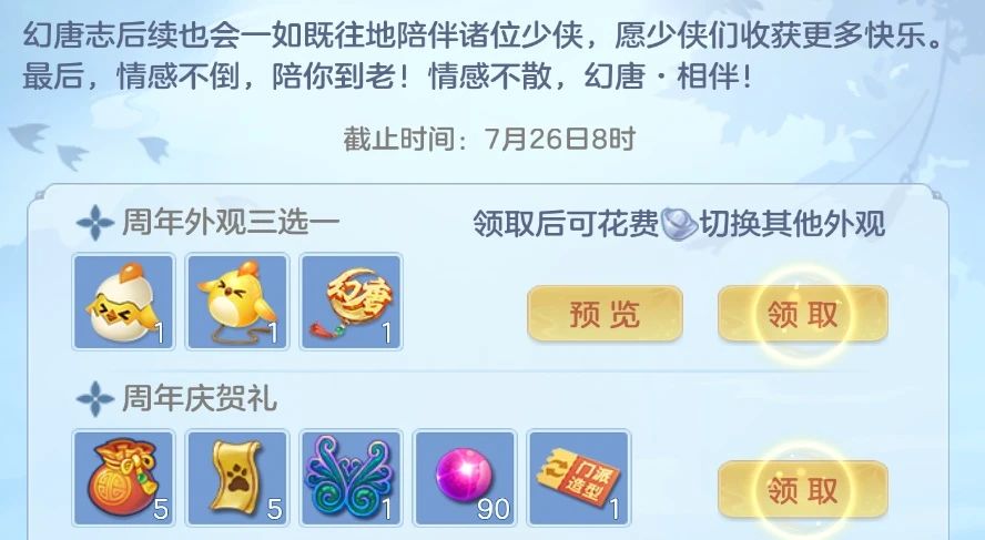 《幻唐志》手游6月28日周年庆系列活动就要上线了,不知少侠们是否期待周年庆的到来呢?周年外观免费领取,造型转换七折优惠!还有新角色动态展示哦! 小玉兔同行 周年大服专属宠“小玉兔”及专属活动“小玉兔同行”即将上线!“小玉兔”拥有特殊技能“水刃斩”,可获得物理伤害降低的水盾状态,并可额外攻击助战; 活动期间,参与各类玩法,获取培养积分,可以对小玉兔进行打书、喂元宵等操作。活动期间累充30元,还会额外赠送小玉兔专属护符(携带高级狂暴+反击技能)。 周年大服“周年·相伴”现已开启预创建,各种专属活动等你来参与哦! 全新角色沐星辰 全新男角色沐星辰即将上线!新角色助力活动即将开启!活动期间,角色造型转换、双武器解锁享7折优惠! 动态展示 周年贺礼 活动期间登录游戏,即可免费领取周年外观与周年庆贺礼!少侠可在三个免费外观中挑选一个领取!不满意的话也可花费银币切换其他外观哦~ *以上是无忧带来的一手爆料* *最终效果可能会有所调整* 除此之外,周年礼包、吉祥寻宝、分享有礼等福利活动也会同步上线哦!6月28日,周年庆系列活动正式上线!全新角色,多种福利,精彩活动等你来参与! 编辑:ssc