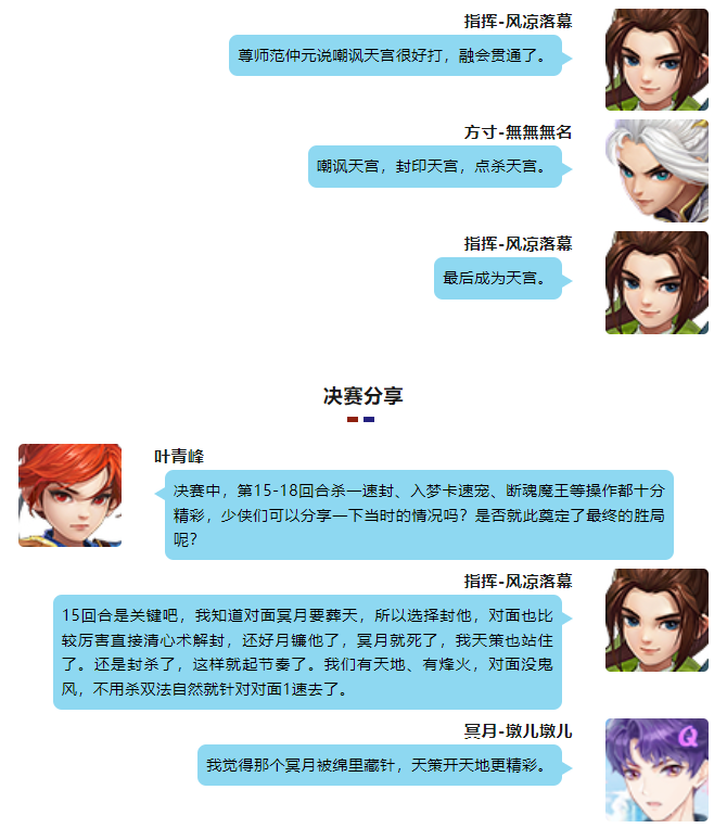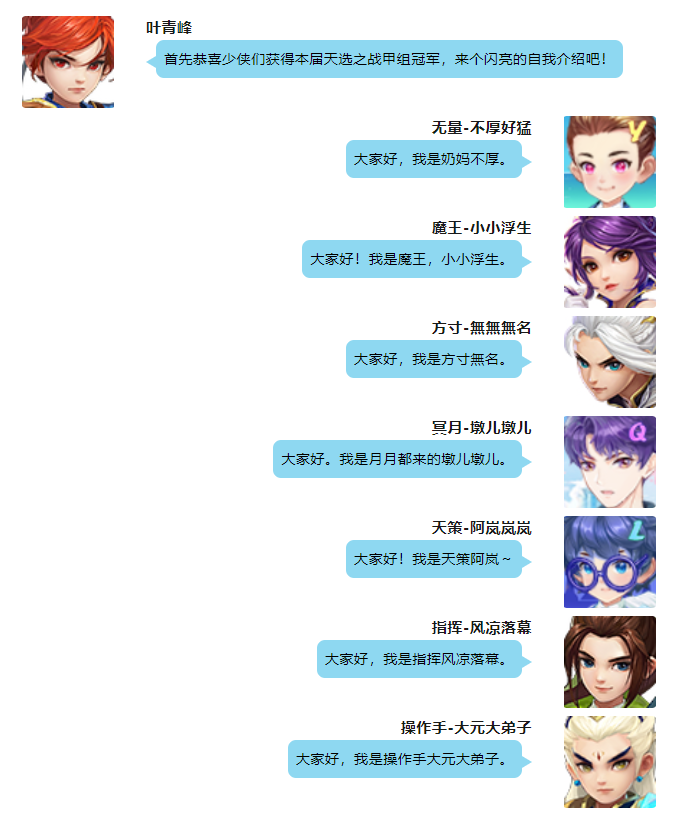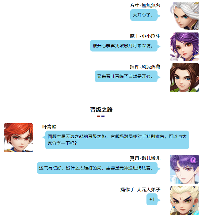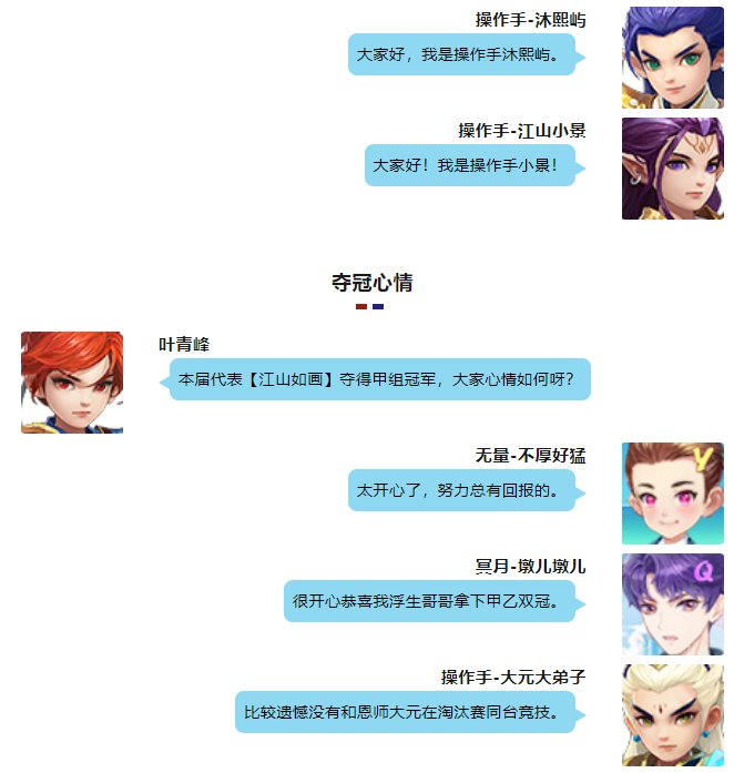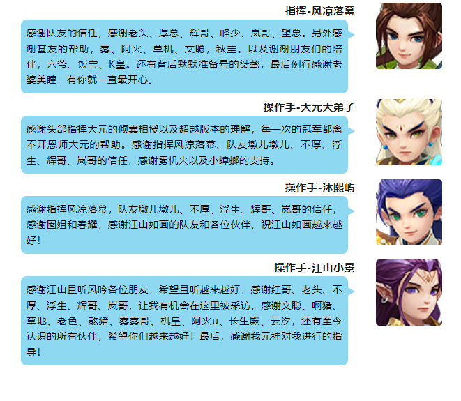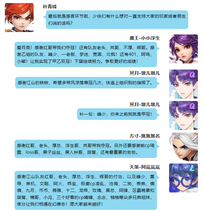 《幻唐志》手游从下月起天选之战、启明之战、排位明星赛的冠军采访将暂时停止,后续调整后将重新上线。 【战队简介】 战队名称:江山如画3队 战队荣誉:第106届天选之战甲组冠军 战队构成:一封、一奶、两物理、一法 无无无名(七星方寸)、不厚好猛(无量)、墩儿墩儿(冥月天)、阿岚岚岚(天策)、小小浮生(魔王山) 接下来和青峰一起来认识一下这支冠军队伍吧! 编辑:ssc