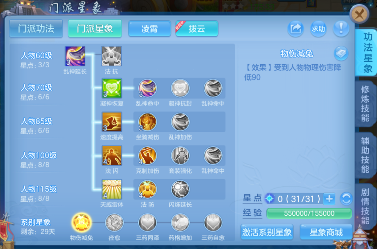《幻唐志》手游星象系统新增5个系别星象,积累经验可领取神兽之灵等奖励! 星象精研 1、服务器等级达110和人物等级达95级解锁; 2、获得经验可额外获得精研经验,精研经验可激活系别星象或在星象商城兑换高级魔兽要诀等道具; 3、累积一定精研经验还能领取简易通灵符、珍兽之灵和神兽之灵等道具。 系别星象 1、星象系统新增5个系别星象,同系别下的各门派新增星象相同; 2、5个系别星象达到对应等级后解锁,解锁后可消耗精研经验激活星象,每次激活持续一段时间。 封系 95级:速度+12 95级:使用酒类道具后,当回合自身宠物受到的伤害结果降低12% 105级:使用酒类道具后,当回合自身人物受伤降低12%,3回合内抗封提高5% 120级:每场战斗可使用药品数量增加1个 飞升130级:当自身魔法低于等级×4时,每回合恢复一定魔法(与贝母花恢复量相当),持续6回合,每场战斗最多触发1次 辅助 95级:速度+12 95级:使用酒类道具后,当回合自身宠物受到的伤害结果降低25% 105级:召唤宠物时,额外使用一次恢复技能(无量使用泽被苍生,普陀使用莲华度世,小丹山煽火增加丹炉进度),每场战斗己方最多触发3次 120级:每场战斗可使用药品数量增加1个 飞升130级:前20回合内,己方每个倒地单位,都会使自身受到伤害降低4% 物理 95级:受到人物物理伤害降低90 95级:每次伤势恢复时,恢复效果额外提高10%,与“痊愈”共存时不生效 105级:宠物使用三级丹药时,为己方另外2个宠物恢复等级×2的气血,每回合己方最多触发1次 120级:每场战斗可使用药品数量增加1个 飞升130级:宠物使用三级丹药时,自身宠物同时恢复等级×4的气血 法系 95级:受到人物伤害降低60 95级:前20回合内,被复活时,气血和伤势恢复额外增加10%,与“延寿”共存时不生效 105级:前20回合内,气血低于50%时,受到狂暴或暴击伤害时有35%几率伤害结果减免20%,与“韧性”共存时不生效 120级:每场战斗可使用药品数量增加1个 飞升130级:前20回合内,复活当回合,受到的伤害降低5%,与“凝重”共存时不生效 *以上是无忧带来的一手爆料* *最终效果可能会有所调整* 编辑:ssc