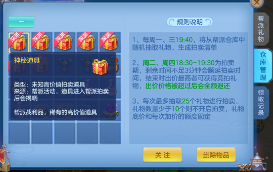 《幻唐志:逍遥外传》重点维护更新内容:深渊入侵与帮派拍卖活动开启!挑战怪物,获取拍品,拍卖竞价,赢取心仪道具!幻唐志逍遥外传深渊入侵和帮派拍卖活动现已上线,给大家带来了新玩法的介绍一起来看看吧! 深渊入侵 派遣宠物对抗怪物,获取血脉源石,还可增加拍品至帮派拍卖中! 对抗怪物 每周一、三晚,少侠们需要派遣宠物对抗怪物,被派遣的宠物会自动完成战斗计算伤害。根据自己的累积伤害,可以获取血脉源石奖励。 帮派奖励 参与深渊入侵活动后,根据全服排名,少侠可获取到不同的礼包奖励,奖励将会发放至本帮派的帮派仓库中,用于后续帮派拍卖。无忧伤害越高,奖励越好,帮派拍卖能获得的道具也会更好哦! 帮派拍卖 每周二与周四晚,可参与帮派拍卖活动。 拍卖清单 每周一、三晚,将会从帮派仓库中随机抽取礼物,生成拍卖清单,最多抽取25个。吉祥多多参与深渊入侵活动,获得更多好奖励,抽取到大奖的概率越高! 参与拍卖 每周二、四晚,少侠们可以参与帮派拍卖活动,对心仪的道具出价,同时与其他帮派成员竞价。拍卖竞价将会以实时更新的形式展现,价格博弈更加激烈!为了心仪的道具,不断竞价,也是一种战斗呢~第一次帮派拍卖活动将在9月9日进行,各位少侠可不要错过了! 目前角色拍卖已支持微信内查看感兴趣的少侠可以扫码挑选喜欢的角色 编辑:ssc