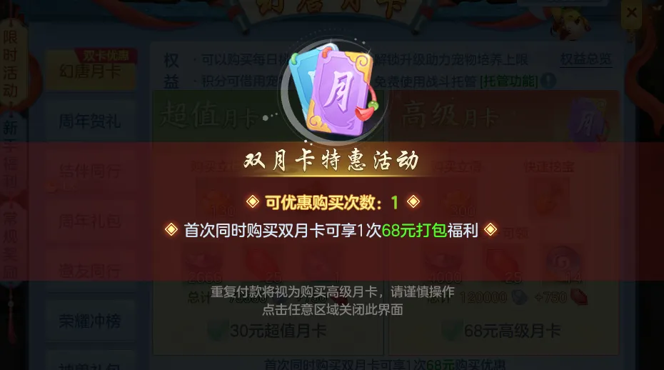 《幻唐志:逍遥外传》现在玩新区有什么福利?幻唐志逍遥外传新服怎么玩?幻唐志逍遥外传新区怎么起号?神兽结缘、灵丹宝库、灵宠培养等新服福利,助力你快速起号! 签到送萌宠 次日签到可领取萌宠“小荷灵”,携带特殊技能【萌宠驰援】;除此之外,萌宠可进修2次,第2次进修可在3个高级技能中选择1个作为第5技能。 宠物携带“萌宠驰援”可以在主人倒地的状态下出场,少侠们在新服前期的体验中容错率会更高。无论是日常挑战还是玩家对战,都不会那么容易被一波打倒! 萌宠培养活动 1)重炮小熊内丹道具提前到开服第6天满足要求即可使用; 2)降低小荷灵宠物进阶所需萌宠珠数量要求; 3)购买月卡可获得萌宠护符,限小荷灵可使用。 灵丹宝库活动 服务器等级达到45级开启活动,每天活跃可获得一定数量储备还童丹与简易通灵符,活动结束时可领取奖励。 新服神兽结缘活动 1)活动期间,神兽礼包售价固定19700金币; 2)限时上架神兽小礼包(神兽源生+神兽聊天框),与神兽礼包共享购买上限; 3)首次神兽造型转换可享85折优惠。 双月卡特惠活动 首次开通双月卡时可享受打包优惠仅需68元。 灵宠培养活动 活动期间对55级宠物洗宠可累积进度领取奖励,每日活跃可领取洗宠券,达成条件还可领取限定成就勋章。 此外苍叶猫洗宠变异达一定次数还可增加其格子出技能概率,达成条件可获得限定成就勋章。 本服苍叶猫天生技能调整为高级连击、高级偷袭、强力、强壮、飞行。 血脉培养活动 达300活跃可领取血脉源石(可金币解锁进阶奖励)、降低前2次保底次数要求助力红纹获取、血脉词条支持使用银币重置。 有了这些福利,玩转新区还不是手拿把掐呀! 编辑:ssc