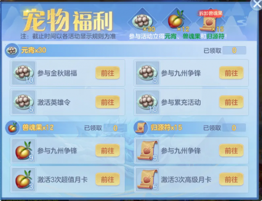 《幻唐志:逍遥外传》参与活动得30个元宵、12个兽魂果、15个可拆卸兽魂果的归源符!今天为大家详细讲讲宠物福利以及新活动九州争锋怎么玩? 宠物福利 金秋大服【天行健】9月26日开启,届时将上线全新宠物福利,助力少侠们培养爱宠!只需参与活动,总共可领取30个元宵!12个兽魂果!以及15个归源符!宠物养成不纠结! 归源符可是好东西!每张归源符可以卸下1个已使用的兽魂果返还至背包!但是要注意,只能对携带等级≤65级的普通宠物使用哦~ 太棒了!前期可以放心给宠物吃兽魂果了,就算不小心吃错或者以后换更强的宠,也可以将兽魂果卸下来重新使用! 新活动九州争锋:共可获得5个元宵、9个兽魂果、9个归源符!(包含相关的战功月活动获得的2个兽魂果)。 金秋赐福活动:共可获得10个元宵! 另外,开通双月卡,在享受68元特惠的同时,还能额外获得最多6个归源符、3个兽魂果。激活英雄令、参与累充活动,再额外获得10个元宵! 九州争锋 服务器<75级时,金秋大服将开启九州争锋活动!活动期间,各帮派通过帮众活跃度、帮派活动的胜利可以提高帮派名次。 活动共分3个阶段,在每个阶段结束后,将根据当前帮派排名来结算奖励!少侠们通过参与日常玩法及活动获得积分,达到指定积分可获得兽魂果等奖励! 归源符!兽魂果!我来啦!帮派的兄弟们,大家一起加油! 编辑:ssc