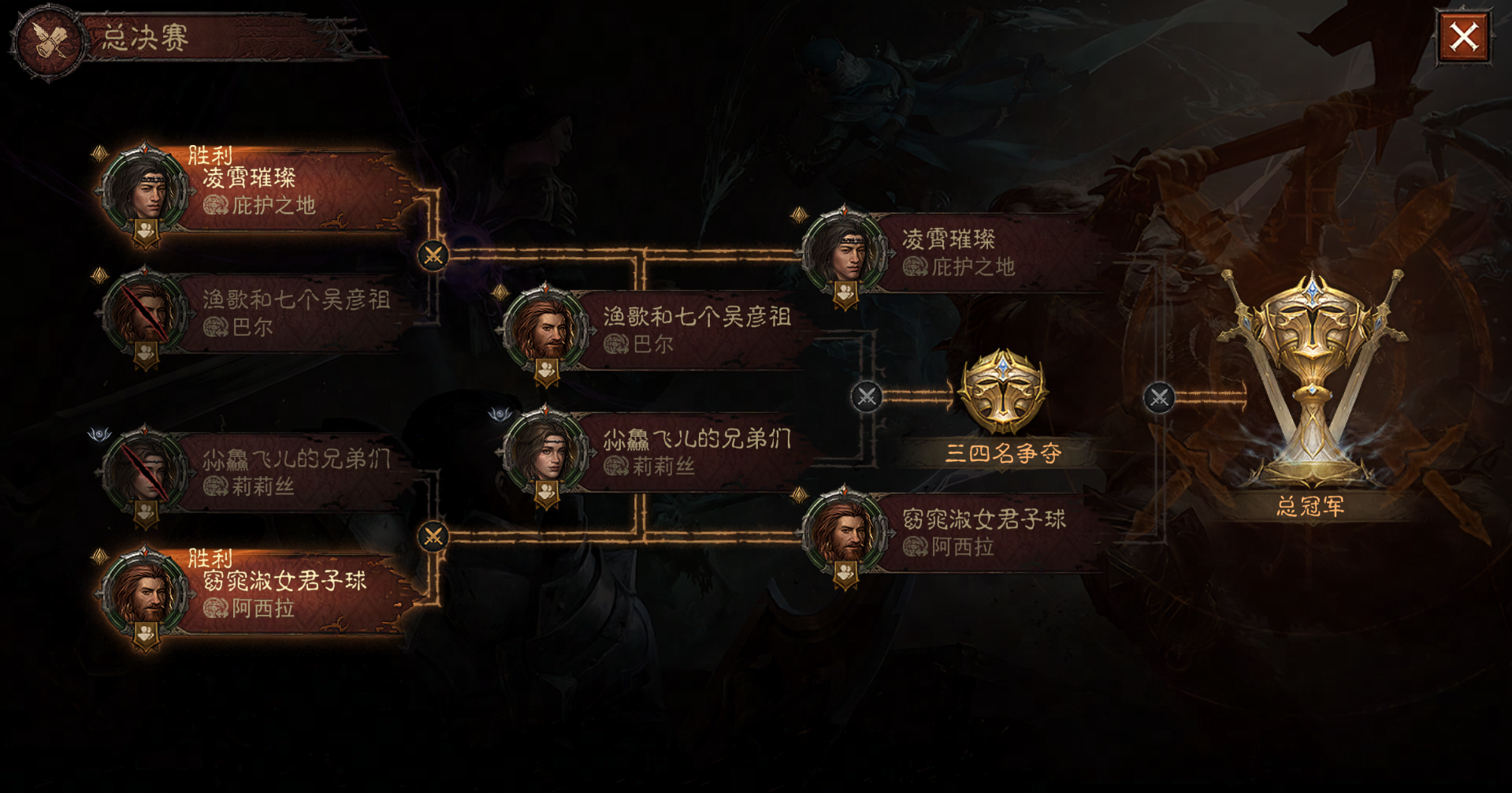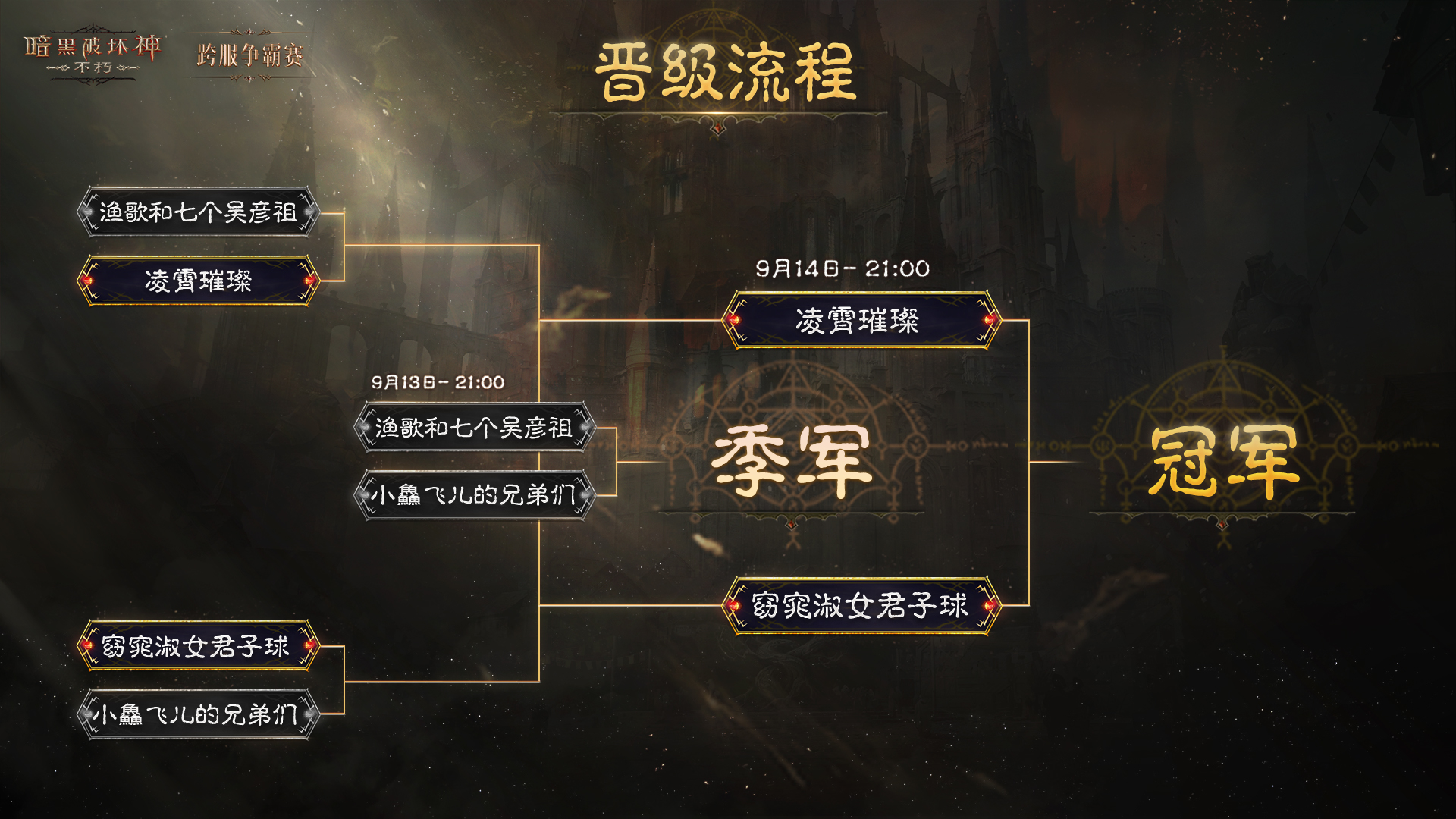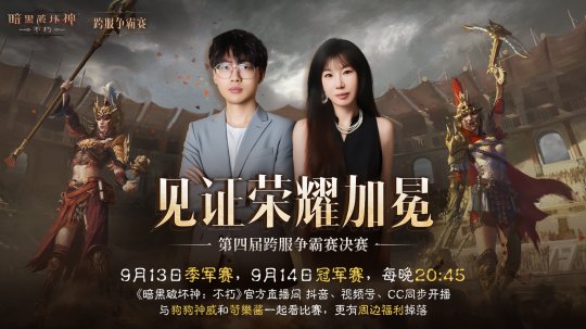 决战已至,谁能问鼎? 《暗黑破坏神:不朽》 第四届跨服争霸赛总决赛 即将开战 哪支队伍会捧起本届赛事的冠军荣耀? 今明两夜,邀你见证! 9月13日 季军赛 9月14日 冠军赛 每晚20:45点 锁定《暗黑破坏神:不朽》官方直播间 抖音、视频号、CC直播同步开播! 特邀解说狗狗神威与苛樂酱 和你一起看比赛!抖音更有周边奖励掉落! 四强战队 英雄集结 本届跨服争霸赛于9月1日开赛,统御沙场的雕像见证了所有参赛战队的热血与汗水。 终于,《暗黑破坏神:不朽》第三届跨服争霸赛四强战队在9月11日夜间决出,以下四支队伍荣耀登榜! 他们分别是(排名不分先后): ● 来自“庇护之地”服务器的【凌霄璀璨】战队 ● 来自“巴尔”服务器的【渔歌和七个吴彦祖】战队 ● 来自“莉莉丝”服务器的【小鱻飞儿的兄弟们】战队 ● 来自“阿西拉”服务器的【窈窕淑女君子球】战队 而后,四支劲旅迎来了更激烈的对战。 在昨晚结束的四进二半决赛中,【凌霄璀璨】战队和【窈窕淑女君子球】战队更胜一筹,战胜了各自的对手,晋级9月14日的冠军赛,向跨服争霸赛的巅峰荣耀发起最后冲锋。 而【渔歌和七个吴彦祖】战队和【小鱻飞儿的兄弟们】战队将在今晚率先拉开本届跨服争霸赛总决赛的帷幕,争夺季军和殿军名次。 四支战队的选手,无一不是历经沙场洗礼的顶尖冒险者,不少更是数次登上跨服争霸赛决赛擂台、甚至是已在英雄殿堂的冠军合影中留下姓名的老牌选手。 实力至上,配合决胜,相信两天的比赛都将精彩纷呈,看点满满! 在总决赛的两场终极对抗中,四强战队将迎来更高强度的Bo5赛制考验,角逐最终的荣耀! 这也是新职德鲁伊首次登台参赛,掌握自然之力的大地守护者将如何撼动战局? 我们也邀请庇护之地所有的冒险者,一同见证本届跨服争霸赛的每一场对局! 巅峰对决,邀你见证 9月13日季军赛、9月14日冠军赛每晚20:45,锁定《暗黑破坏神:不朽》直播间,与特邀解说嘉宾狗狗神威和苛樂酱,第一时间,见证荣耀加冕! 官方微信视频号、抖音和CC直播间的直播!与你不见不散!抖音直播间更有周边奖励掉落!欢迎冒险者们来一起看比赛,拿奖励! 别忘了你在竞猜活动中做出的大胆预测,守候直播间等待“开奖”,今明两晚,就是“明灯”或“冥灯”的揭晓时刻! 群雄竞逐,即将开战!今明两天,决战之夜,邀你一同见证《暗黑破坏神:不朽》第四届跨服争霸赛传奇的诞生! 编辑:月光下完美
