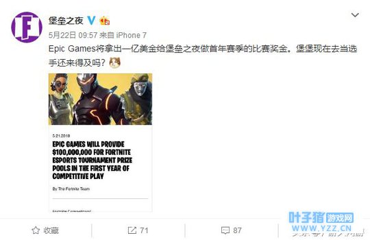 堡垒之夜将投入一亿美元作为奖金 举办电竞