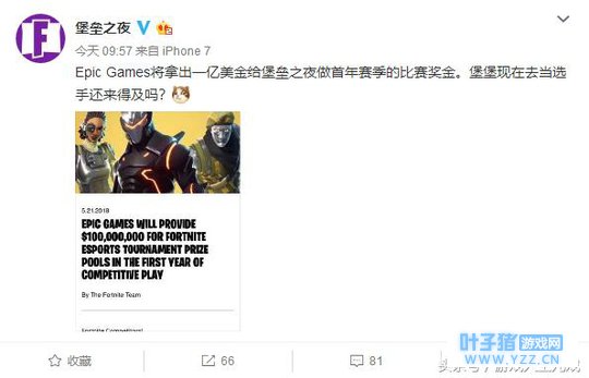 堡垒之夜将投入一亿美元作为奖金 举办电竞比赛