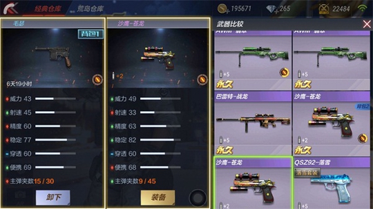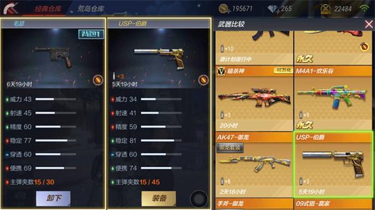 如图,毛瑟和橙色品质手枪—— USP- 伯爵相比,前者威力、射速、精度领先后者,稳定、便携和主弹夹数低于后者,其他保持一致,即:论输出强度,前者占优;论续航和作战稳定性,后者占优。 毛瑟 VS 沙鹰 - 苍龙