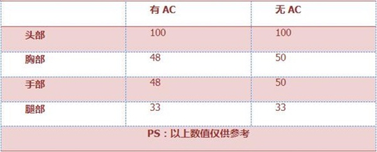 根据上述信息,我们可以看出:有 AC 时,命中目标头部,一击毙命,其他部位需 3~4 枪。无 AC 时,命中敌人头部依旧是一枪,但命中身体却变为 2 枪,腿部仍旧是 4 枪。 枪械数据