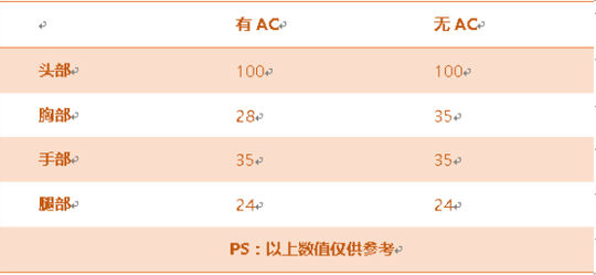 根据上述信息,我们可以看出:无论有无 AC ,只要被 AK47-B 击中头部则必然淘汰。其次,命中目标胸口,若其无 AC ,则仅需 3 枪,反之 4 枪,其他位置保持一致。 核心数据